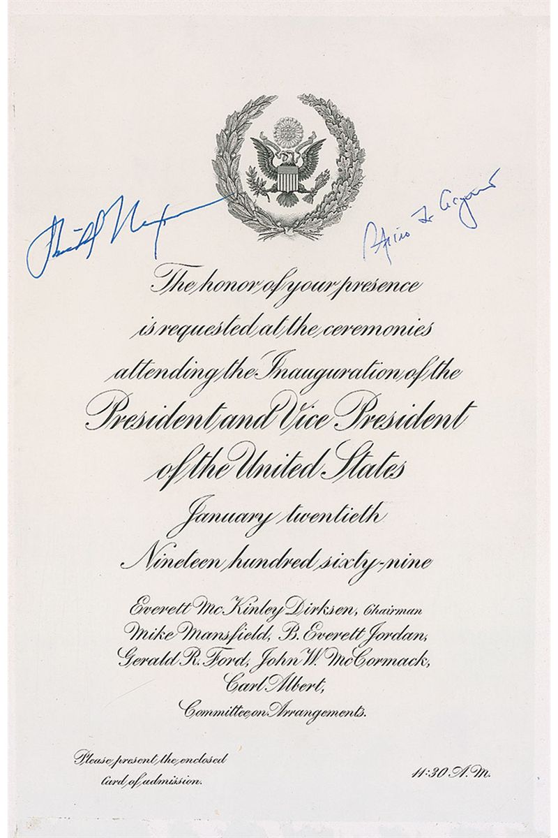 Printed invitation to the inauguration of Richard Nixon and Spiro Agnew, 6.25 x 9.75, held on January 20, 1969, signed in blue ink by Richard Nixon and in blue ballpoint by Spiro Agnew. In fine condition, with mounting remnants along edges and back of second integral page.