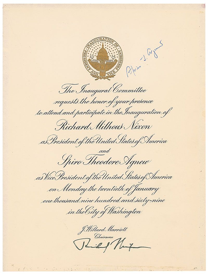 Embossed invitation to the inauguration of Richard Nixon and Spiro Agnew, 8.25 x 10.75, held on January 20, 1969, signed at the bottom in black felt tip by Richard Nixon and in blue ink by Spiro Agnew. Invitation is affixed to a slightly larger sheet of red cardstock. In fine condition, with light surface loss and adhesive remnants along edges.