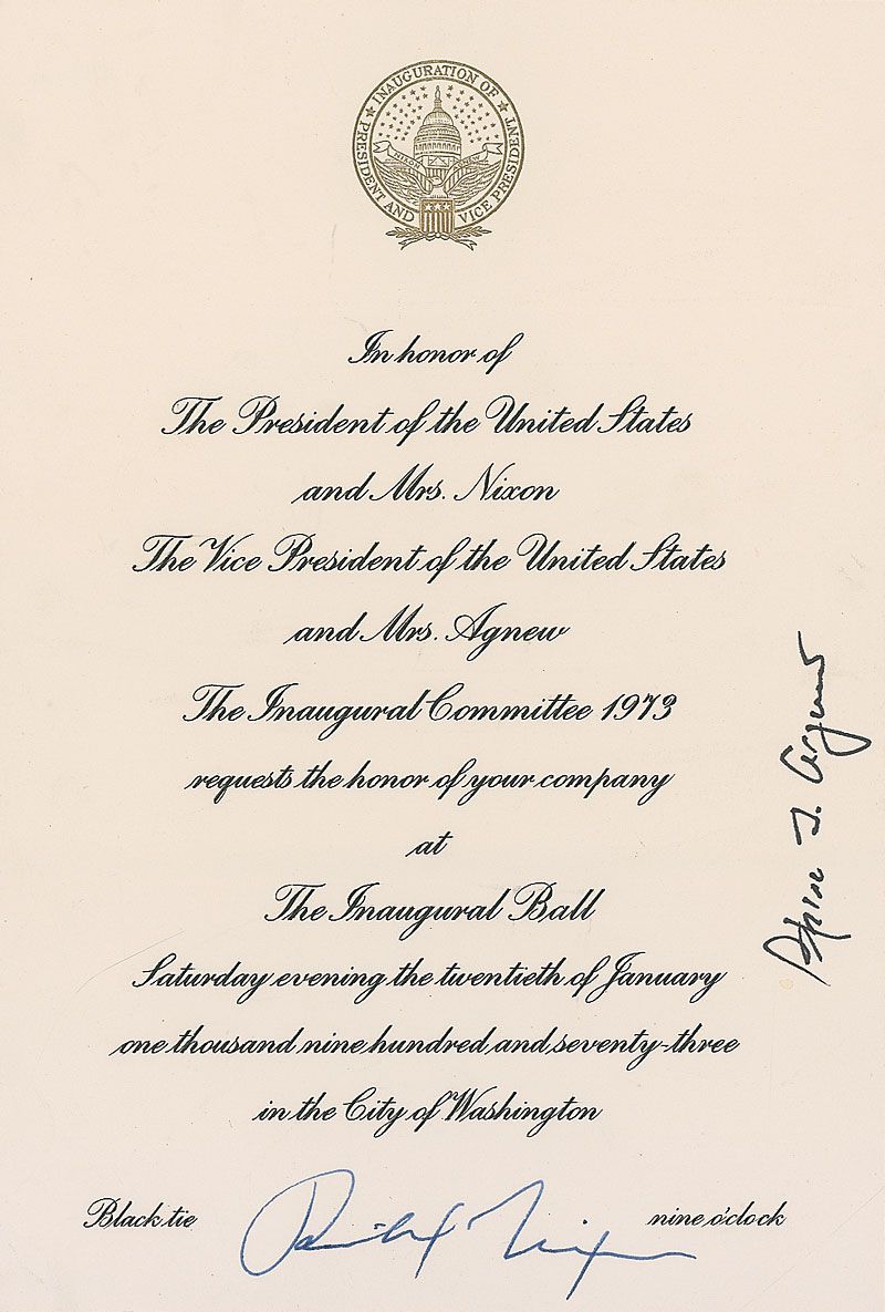 Engraved invitation to the 1973 Inaugural Ball, 5.25 x 7.5, signed along the bottom in blue ink by Nixon and along the right edge vertically in black ink by Spiro Agnew. In very fine condition.