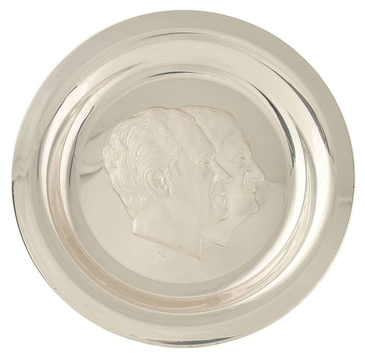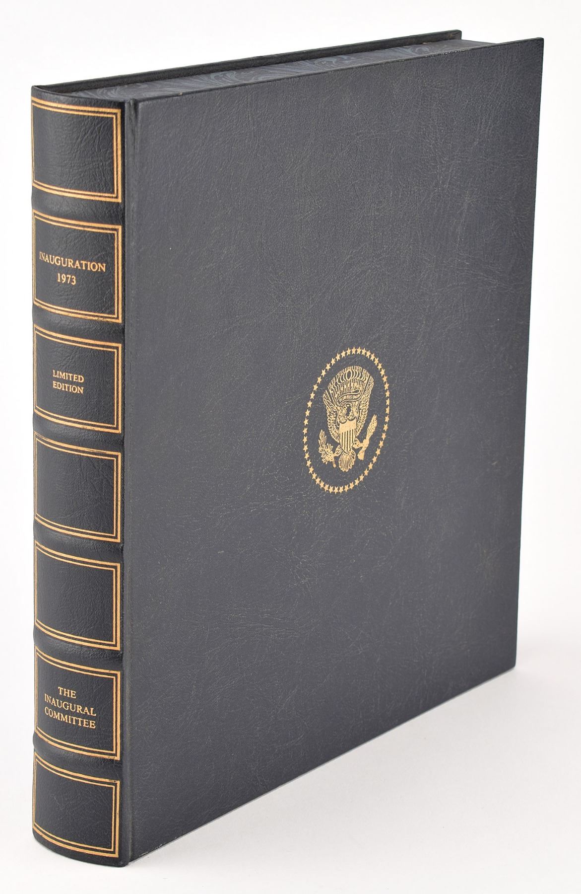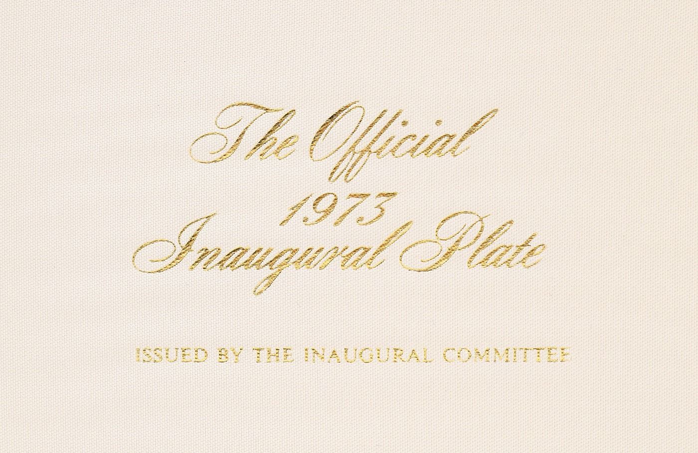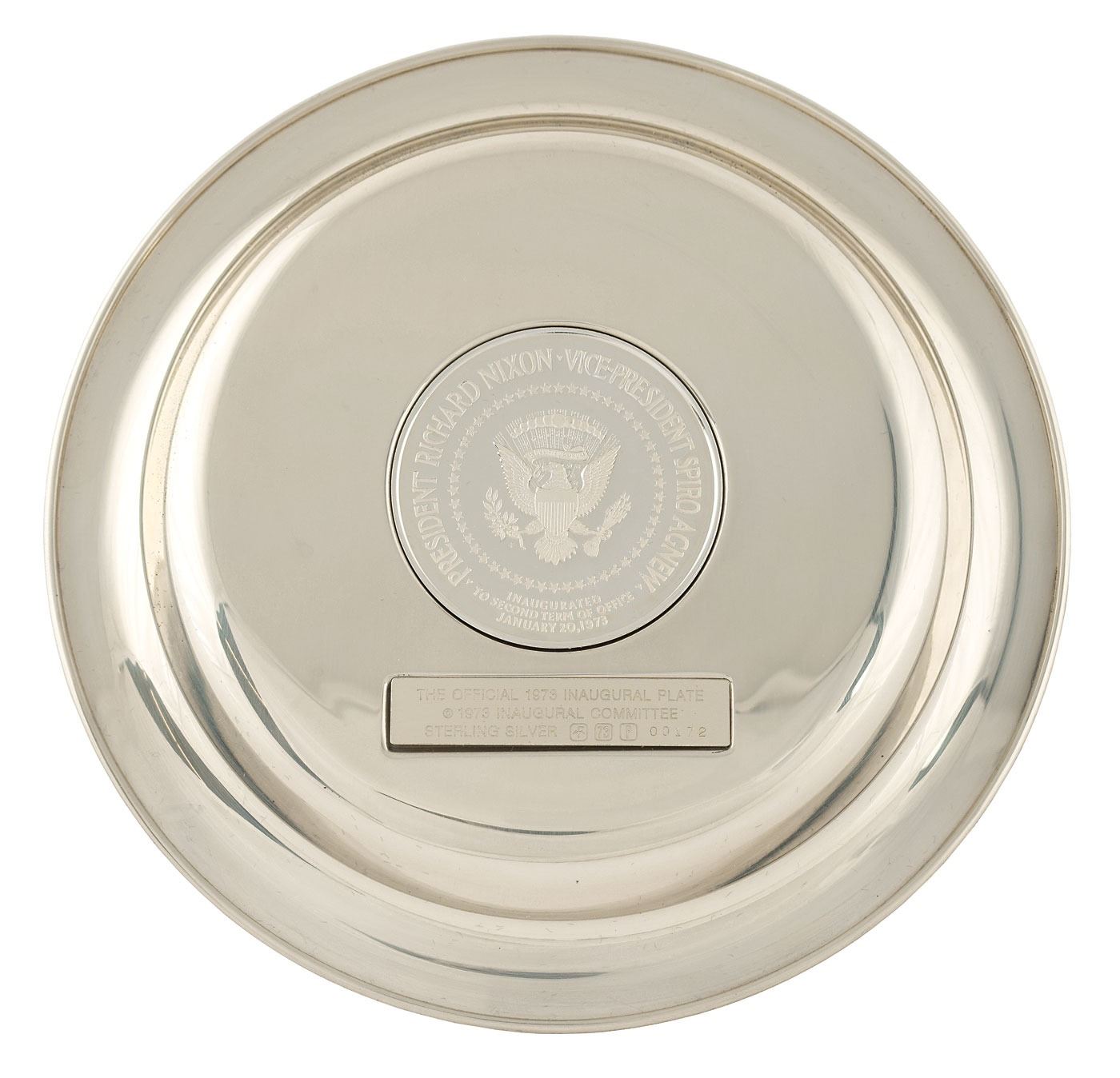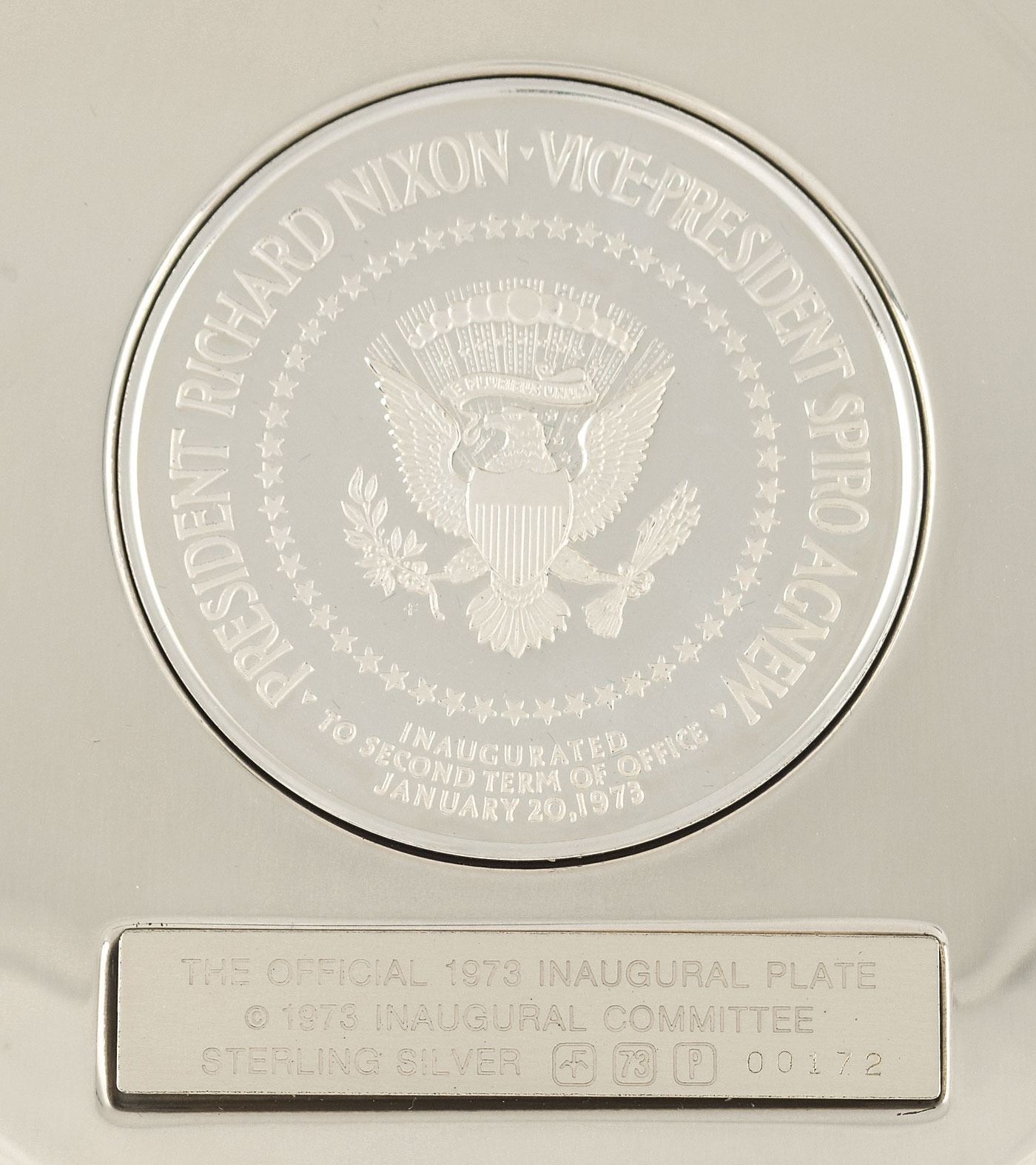 Sterling silver commemorative plate issued by the Franklin Mint to honor the second inauguration of President Richard Nixon and Vice President Spiro Agnew in 1973, measuring 8? in diameter and weighing 359 grams, featuring portraits of the two leaders in profile. Reverse features a presidential seal, engraved below, "The Official 1973 Inaugural Plate, 1973 Inaugural Committee, Sterling Silver." Housed in its original leatherbound clamshell case with gilt-stamped lettering. In fine condition.
