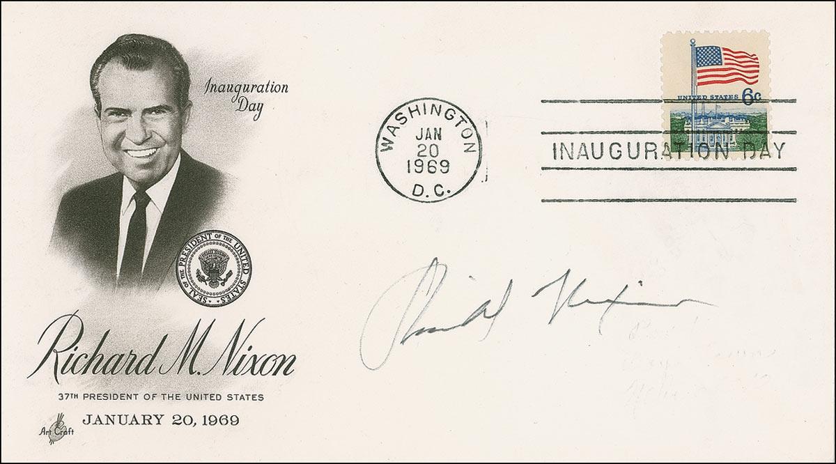 Inaugural Day postal cover with a cachet honoring Nixon’s inauguration, signed in black ink by Nixon. In fine condition, with a few light pencil remnants under signature.