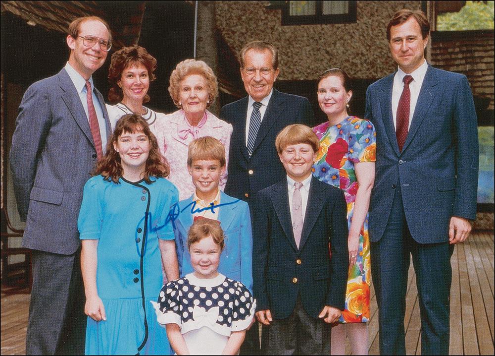 Color 7 x 5 postcard photo of Nixon posing together with his wife and family at their home on the Nixon’s 50th wedding anniversary, signed in blue ink. In fine condition. Accompanied by a 1993 TLS from Nixon’s assistant acknowledging the photo and stating “I can assure you that the signature on it is genuine.”