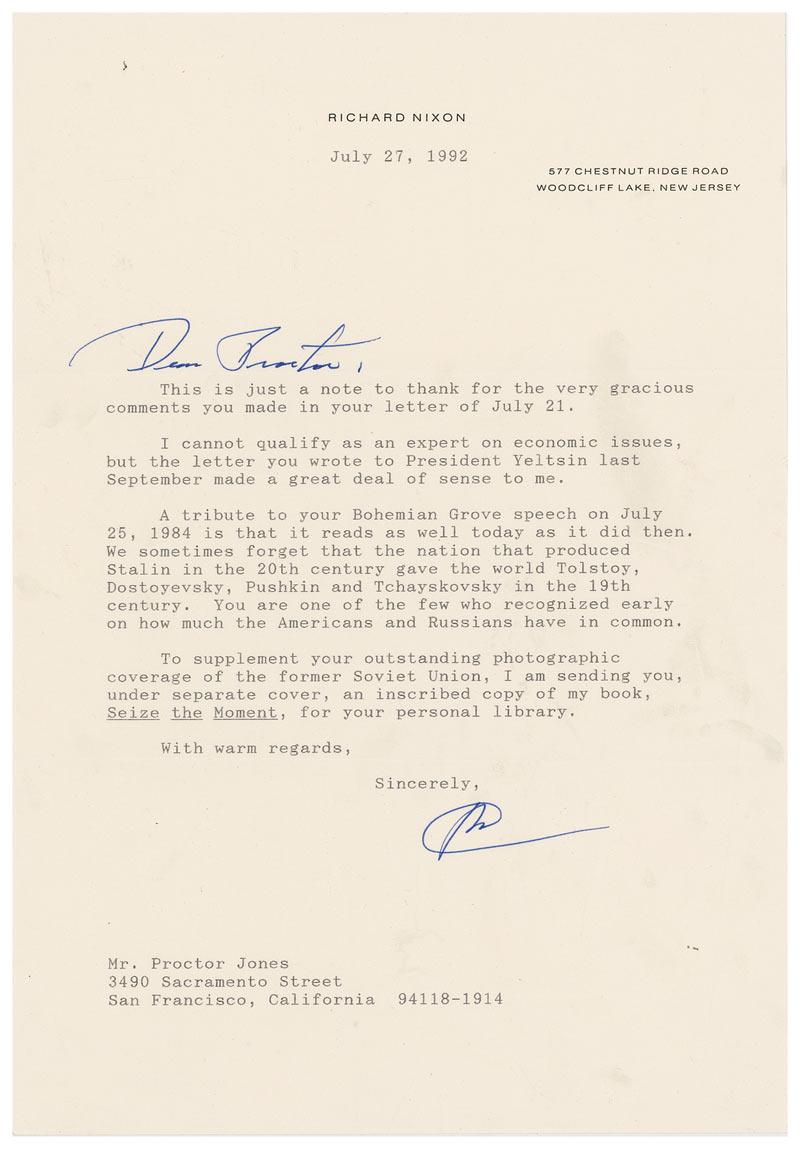 TLS signed “RN,” one page, 7.25 x 10.5, personal letterhead, July 27, 1992. Letter of thanks to Proctor Jones with Nixon handwriting the greeting “Dear Proctor.” In part: “I cannot qualify as an expert on economic issues, but the letter you wrote to President Yeltsin last September made a great deal of sense to me. A tribute to your Bohemian Grove speech on July 25, 1984, is that it reads as well today as it did then. We sometimes forget that the nation that produced Stalin in the 20th century gave the world Tolstoy, Dostoyevsky, Pushkin, and Tchayskovsky [sic] in the 19th century. You are one of the few who recognized early on how much the Americans and Russians have in common.” In fine condition. Nixon had visited the Soviet Union as president in 1972 to address the topic of nuclear peace and apparently shared Jones’s same ideas on the Russians.