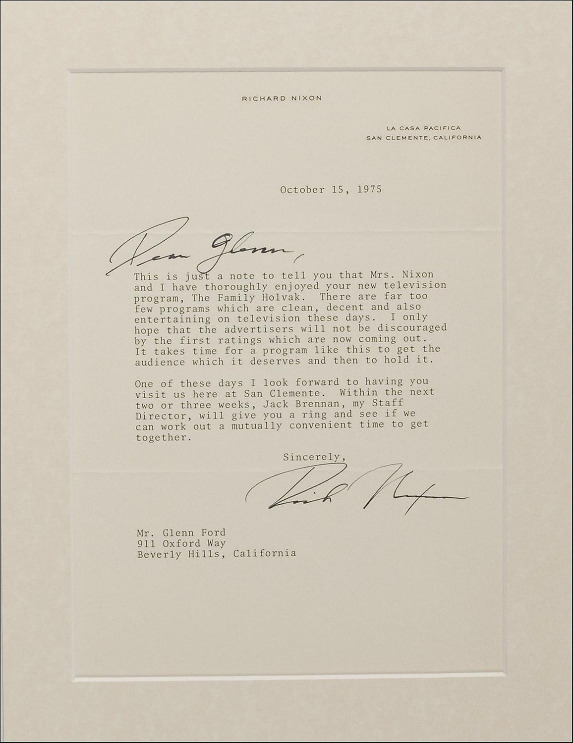 TLS signed “Dick Nixon,” one page, 6.75 x 9.5, personal letterhead, October 15, 1975. Letter to Glenn Ford. In part: “This is just a note to tell you that Mrs. Nixon and I have thoroughly enjoyed your new television program, The Family Holvak. There are far too few programs which are clean, decent, and also entertaining on television these days. I only hope that the advertisers will not be discouraged by the first ratings which are now coming out. It takes time for a program like this to get the audience which it deserves and then to hold it.” Nixon has also handwritten the greeting at the top, “Dear Glenn.” Matted to an overall size of 9 x 12. In fine condition, with horizontal fold through tops of a couple letters of signature. Despite Nixon’s appreciation of the program, The Family Holvak was canceled after just 10 episodes.