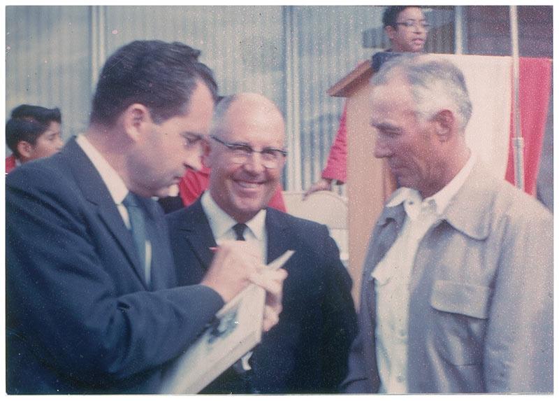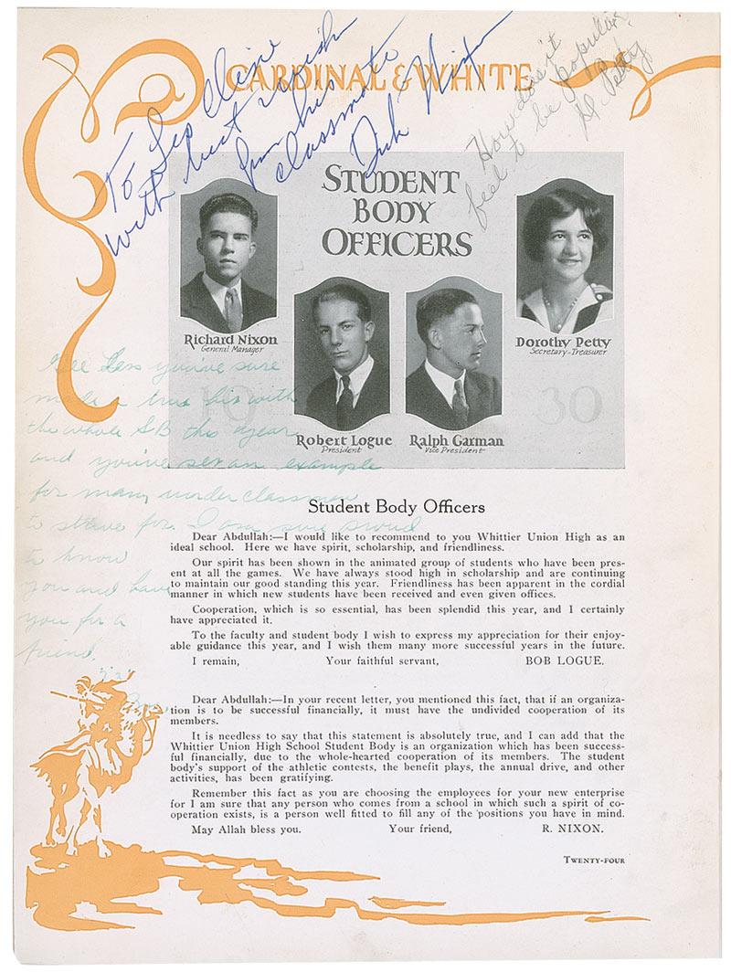 Rare 1930 Whittier Union High School yearbook, Cardinal & White, 191 pages, 8.25 x 10.75, later signed and inscribed in blue ballpoint on page 24, “To Leo Cline with best wishes from his classmate, Dick Nixon,” on the page picturing Nixon as a Student Body Officer. Nixon also appears on an unsigned Constitutional Orators photo on page 155. In very good condition, with some light cover wear with the front and back covers and the adjacent pages a little loose, scattered light page toning, and the signatures of several other classmates throughout the yearbook. Accompanied by a photo of Nixon taken at the time of the signing.