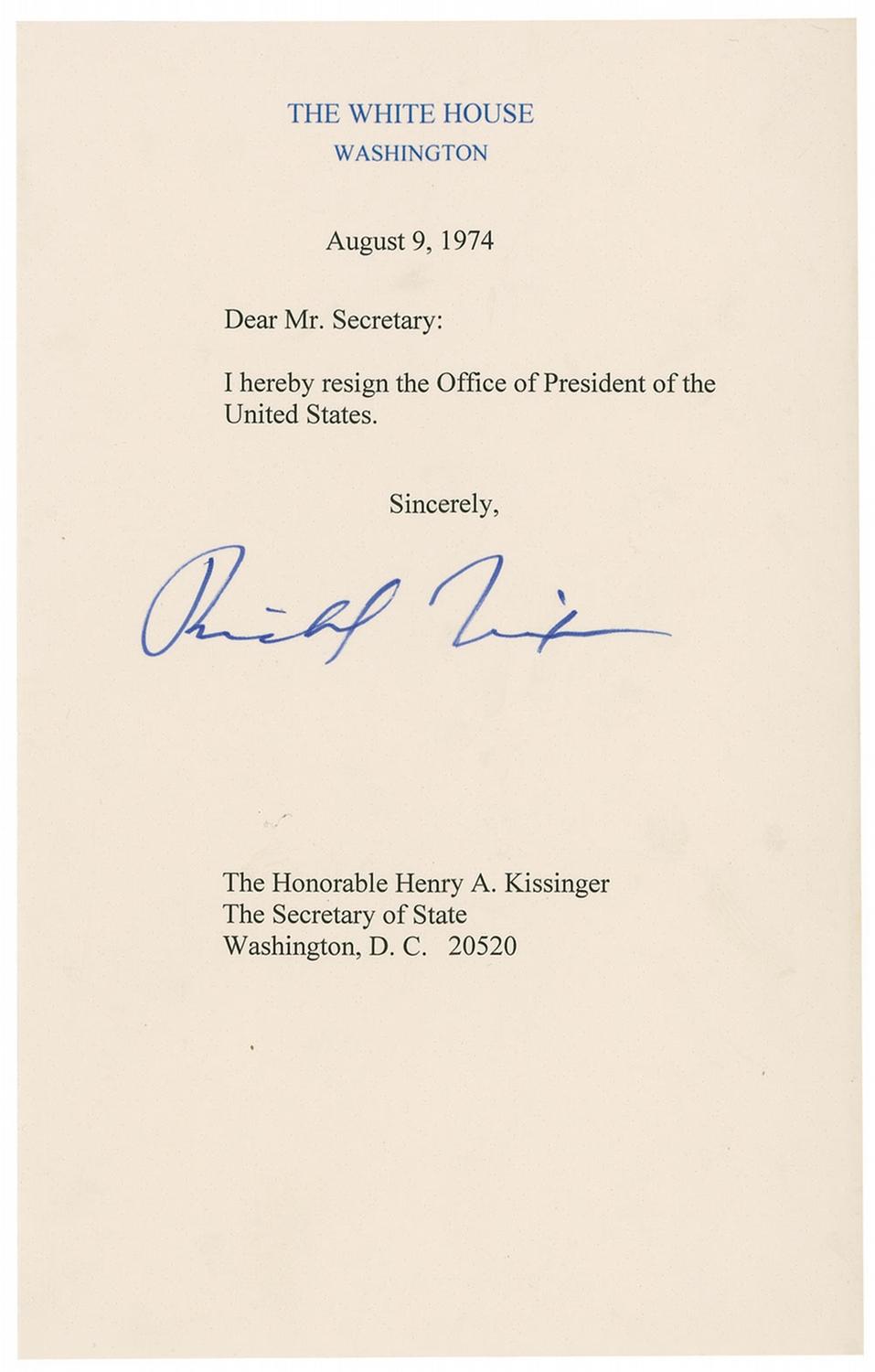 Typed souvenir presidential resignation, one page, 5 x 8, on mock White House letterhead, dated August 9, 1974 (but signed later). Nixon’s famous communication to Secretary of State Henry Kissinger: “Dear Mr. Secretary: I hereby resign the Office of President of the United States.” Signed at the conclusion in blue felt tip by Nixon. In fine condition.