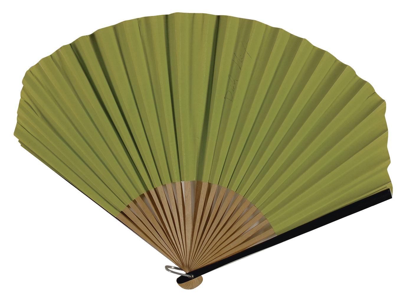 Green paper fan, measuring 12.5 inches closed, opening to an impressive 17 inches wide, signed in black ink on one of the ribs, “Dick Nixon.” In fine condition. Accompanied by a postal envelope, with a notation written in a collector’s hand, “Dick Nixon, Autograph on Fan, Knotts Berry Farm 8/16/68,” and a full letter of authenticity from PSA/DNA.