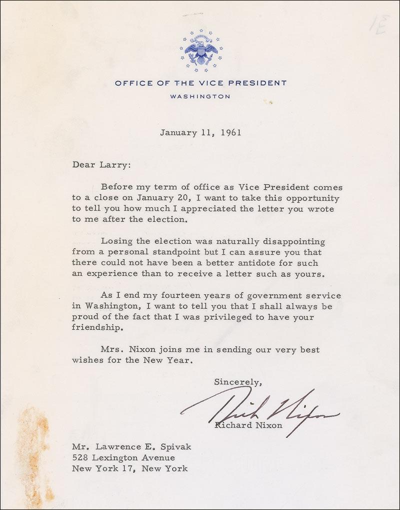 TLS signed “Dick Nixon,” one page, 7 x 9, Office of the Vice President letterhead, January 11, 1961. Letter to a supporter. In part: “Before my term of office as Vice President comes to a close on January 20, I want to take this opportunity to tell you how much I appreciated the letter you wrote to me after the election. Losing the election was naturally disappointing from a personal standpoint but I can assure you that there could not have been a better antidote for such an experience than to receive a letter such as yours. As I end my fourteen years of government service in Washington, I want to tell you that I shall always be proud of the fact that I was privileged to have your friendship.” Staple hole to top edge, crease to top right, and toning to lower left corner from adhesive on the reverse, otherwise fine condition.