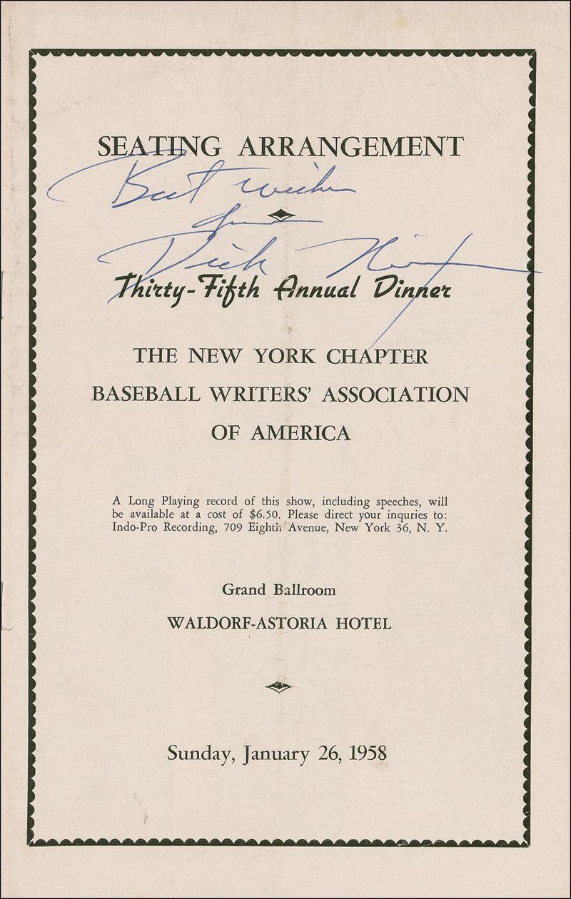 Seating arrangement program for the 35th annual dinner of the New York Chapter of the Baseball Writers’ Association of America, 6.25 x 10, held on January 26, 1958, at the Waldorf-Astoria Hotel, signed in ballpoint on the front cover “Best wishes from Dick Nixon.” In very good condition, with a central vertical crease touching his sentiment, scattered wrinkles, some light staining, and a PSA/DNA authentication sticker affixed to an inside page. Accompanied by the evening’s entertainment program and a full letter of authenticity from PSA/DNA.