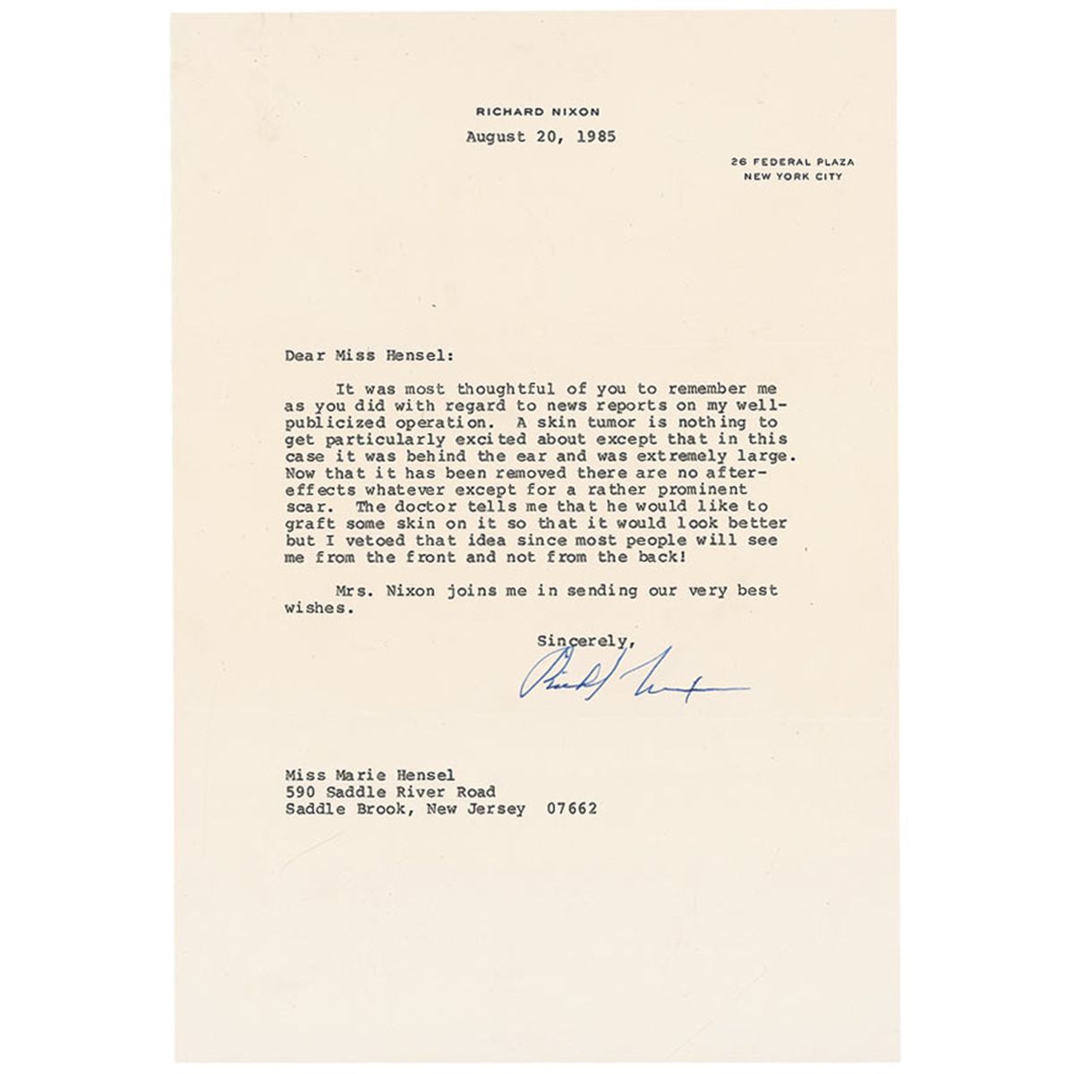 TLS, one page, 7.25 x 10.5, personal letterhead, August 20, 1985. Nixon responds to an admirer following an operation. In full: “It was most thoughtful of you to remember me as you did with regard to news reports on my well-publicized operation. A skin tumor is nothing to get particularly excited about except that in this case it was behind the ear and was extremely large. Now that it has been removed there are no after-effects whatever except for a rather prominent scar. The doctor tells me that he would like to graft some skin on it so that it would look better but I vetoed that idea since most people will see me from the front and not from the back!” In fine condition, with a few wrinkles and surface impressions.
