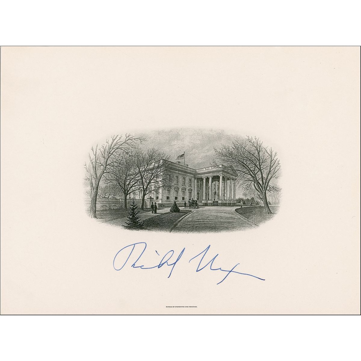 Engraved portrait of the White House, 8 x 6, by the Bureau of Engraving and Printing, signed under the image in blue ink by Nixon. In fine condition.