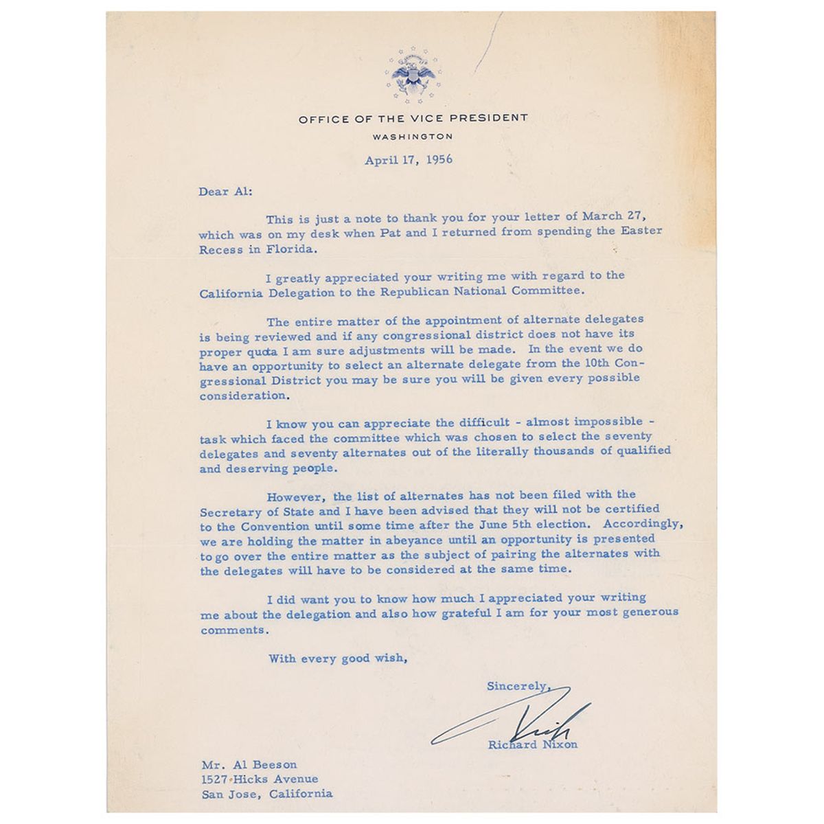 TLS signed “Dick,” one page, 8 x 10.5, Office of the Vice President letterhead, April 17, 1956. Letter to Al Beeson. In part: “I greatly appreciated your writing me with regard to the California Delegation to the Republican National Committee. The entire matter of appointment of alternate delegates is being reviewed and if any congressional district does not have its proper quota I am sure adjustments will be made. In the event we do have an opportunity to select an alternate delegate from the 10th Congressional District you may be sure you will be given every possible consideration.” Block of toning to top right, stray ink mark to top edge, and a diagonal crease to right side, otherwise fine condition. Accompanied by the original mailing envelope.