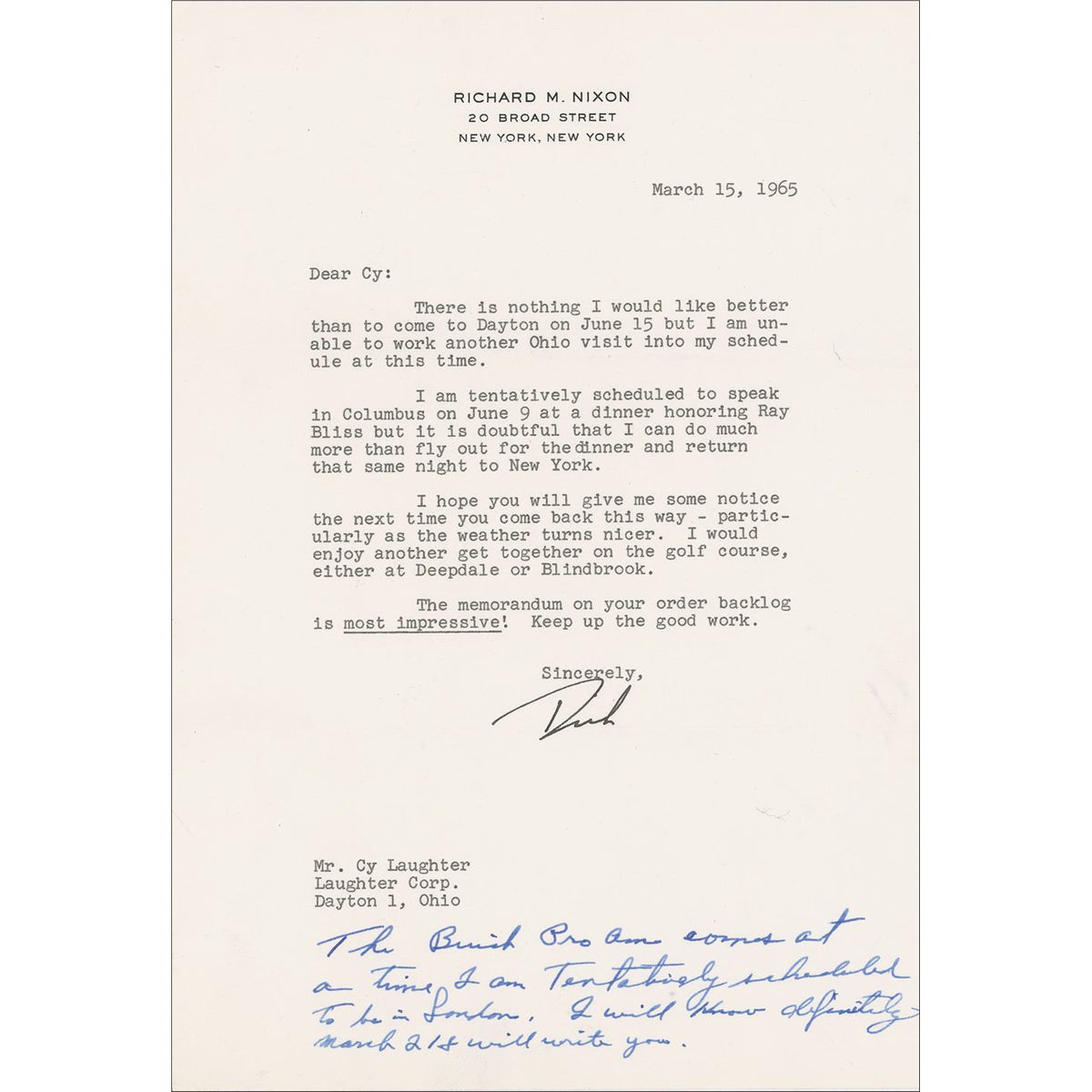 TLS signed “Dick,” one page, 7.25 x 10.5, personal letterhead, March 15, 1965. Letter to Cy Laughter. In part: “There is nothing I would like better than to come to Dayton on June 15 but I am unable to work another Ohio visit into my schedule…I am tentatively scheduled to speak in Columbus…I hope you will give me some notice the next time you come back this way…I would enjoy another get together on the golf course, either at Deepdale or Blindbrook.” At the bottom, Nixon writes a brief postscript which reads, “The Buick Pro Am comes at a time I am tentatively scheduled to be in London. I will know definitely March 2 & I will write you.” In fine condition.