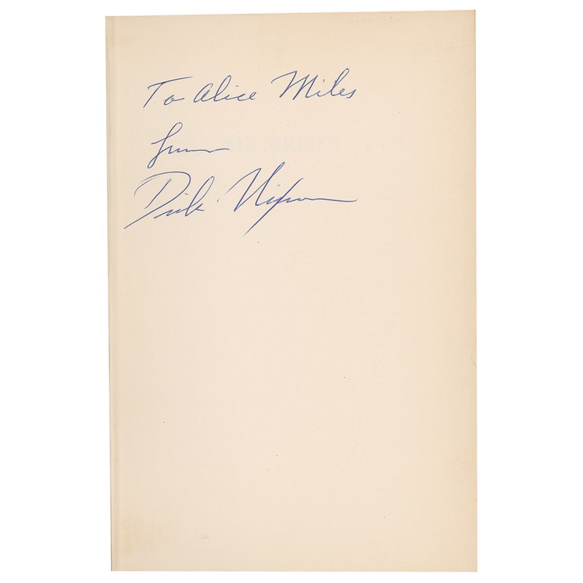 Signed book: Six Crises. First edition. NY: Doubleday, 1962. Hardcover with dustjacket, 6.5 x 9.5, 460 pages. Signed and inscribed on the first free end page, “For Alice Miles from Dick Nixon.” In very good condition, with light toning and pencil remnants to top of signed page, pencil notes to back of half-title page, toning to last free end page and back pastedown, and scattered light wear and creasing to dustjacket.