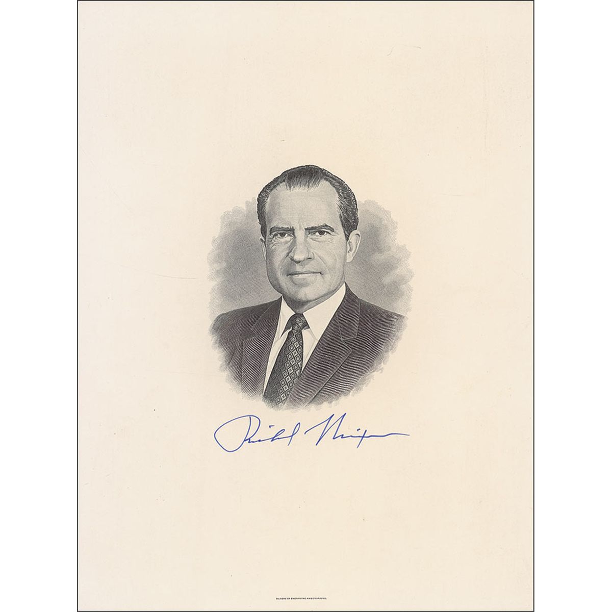 Engraved portrait of Nixon, 9 x 12, by the Bureau of Engraving and printing, signed under his image in blue ink. Scattered bends and creases to borders, most of which could be matted out, otherwise fine condition.