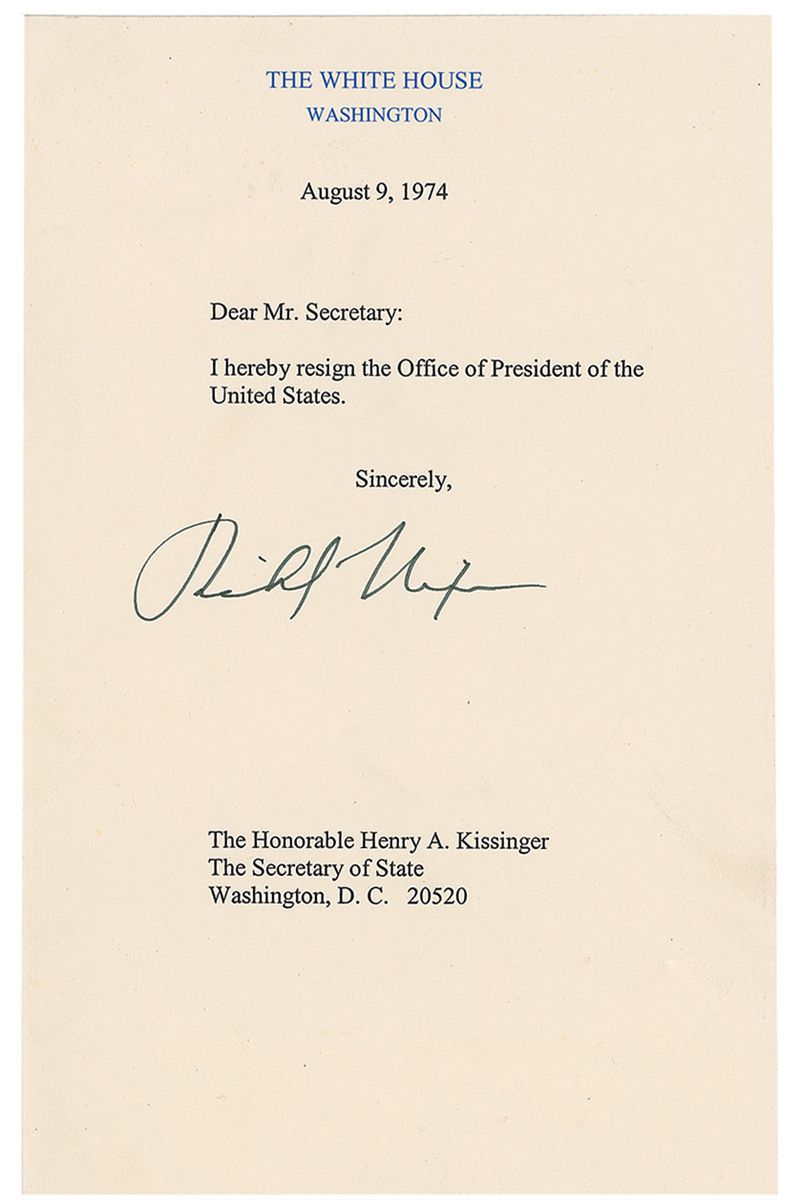 Typed souvenir presidential resignation, one page, 5 x 8, on mock White House letterhead, dated August 9, 1974 (but signed later). Nixon’s famous communication to Secretary of State Henry Kissinger: “Dear Mr. Secretary: I hereby resign the Office of President of the United States.” Signed at the conclusion in black ink by Nixon. In fine condition.