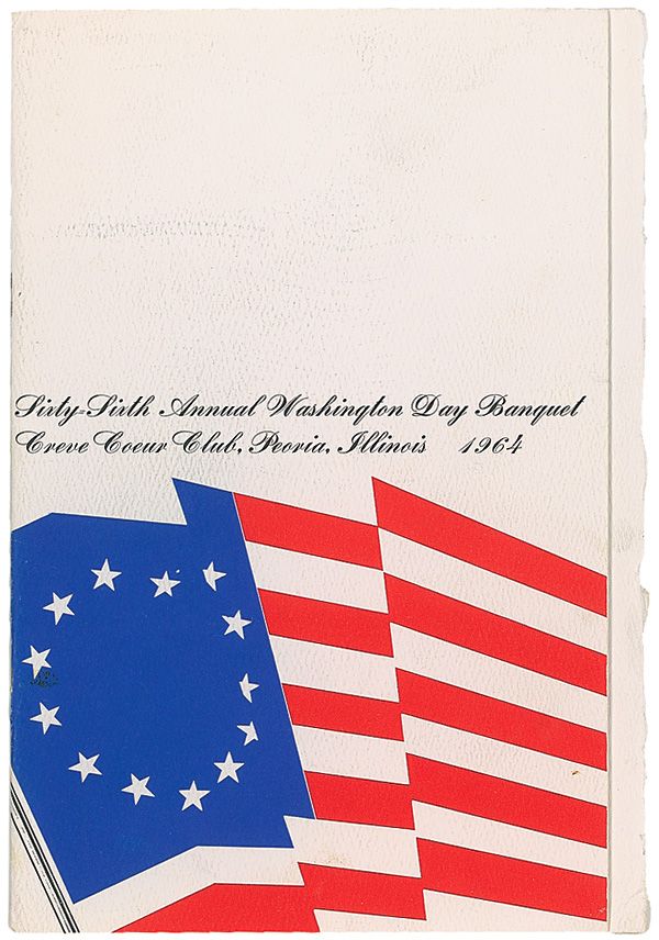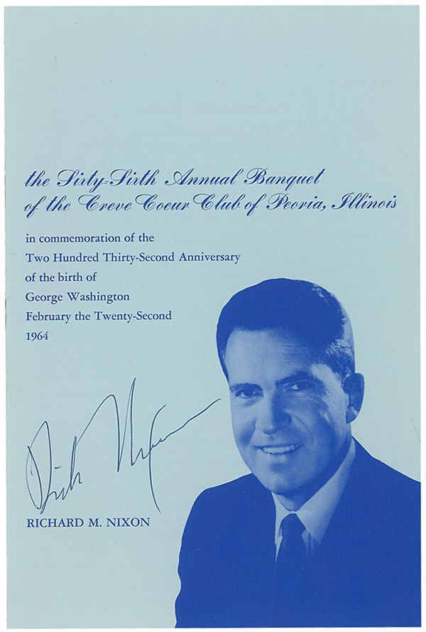 Program from the Sixty-Sixth Annual Washington Day Banquet, held in Peoria, Illinois, in 1964, signed on the first page in black ink next to his image, “Dick Nixon.” In fine condition.