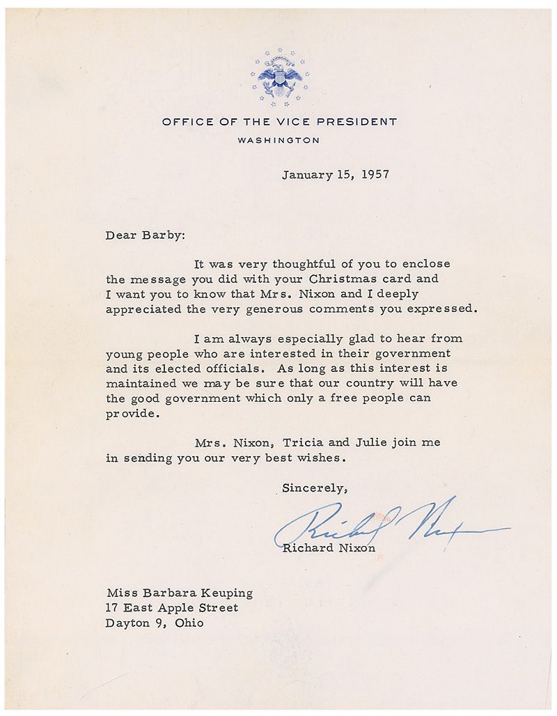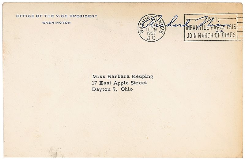 TLS, one page, 7 x 9, Office of the Vice President letterhead, January 15, 1957. Nixon writes to “Barby” Keupig of Dayton, Ohio, in part: “I am always especially glad to hear from young people who are interested in their government and its elected officials. As long as this interest is maintained we may be sure that our country will have the good government which only a free people can provide.” Some light creasing, light toning, and a faint spot of soiling affecting the last letter of the first name of the signature, otherwise fine condition. Accompanied by the original mailing envelope.