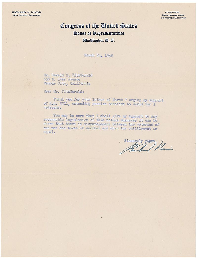 TLS, one page, 8 x 10.5, Congress of the United States letterhead, March 24, 1948. Letter to a constituent. In full: “Thank you for your letter of March 7 urging my support of H.R. 5311, extending pension benefits to World War I veterans. You may be sure that I shall give my support to any reasonable legislation of this nature whenever it can be shown that there is disparagement between the veterans of one war and those of another when the entitlement is equal.” In fine condition.