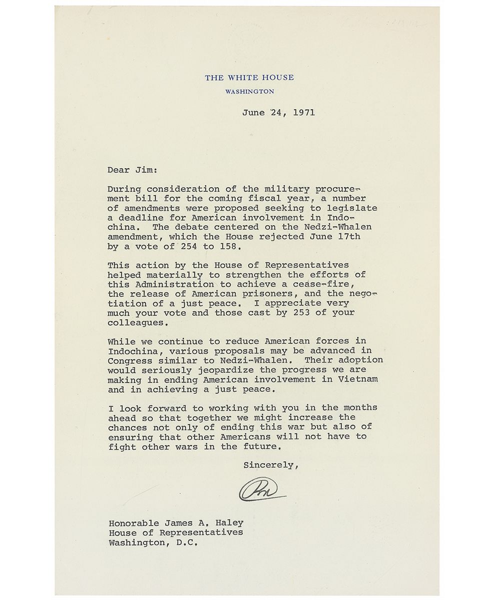 TLS as president signed “RN,” one page, 6.75 x 10.5, White House letterhead, June 24, 1971. Letter to Representative James A. Haley thanking him for his no vote on the Nedzi-Whalen amendment and concerning future amendments to bring an end to American involvement in Indochina. In part: “This action by the House of Representatives helped materially to strengthen the efforts of this Administration to achieve a cease-fire, the release of American prisoners, and the negotiation of a just peace…While we continue to reduce American forces in Indochina, various proposals may be advanced in Congress similar to the Nedzi-Whalen. Their adoption would seriously jeopardize the progress we are making in ending the involvement in Vietnam and in achieving a just peace.” In fine condition.