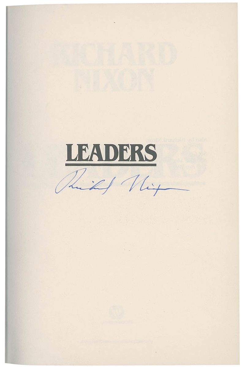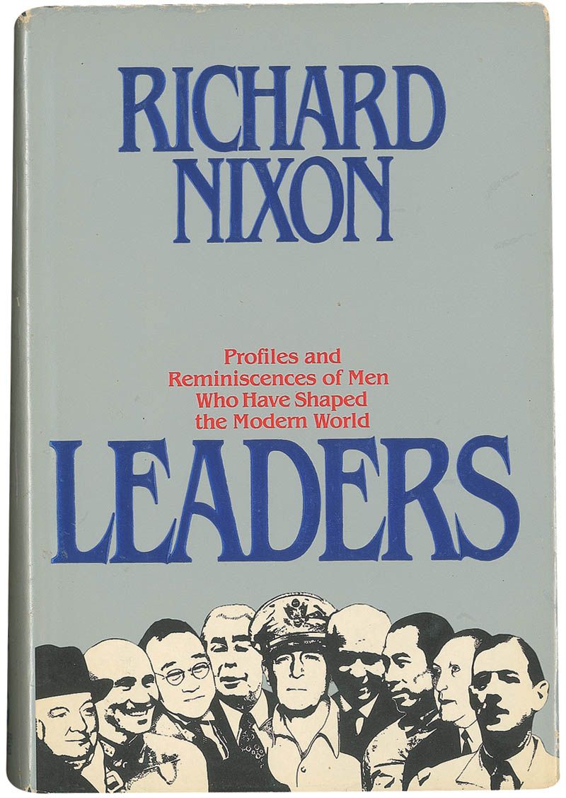 Signed book: Leaders. First edition, first printing. NY: Warner Books, 1982. Hardcover with dustjacket, 6.25 x 9.25, 371 pages. Signed on the half-title page in blue ink. In fine condition, with scattered creases and edge tears to dustjacket.