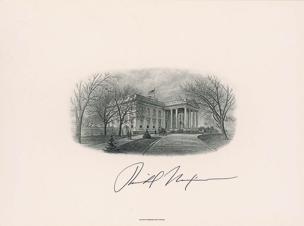 Engraved portrait of the exterior of the White House, 8 x 6, by the Bureau of Engraving and Printing, signed in the lower border in black felt tip. In very fine condition.