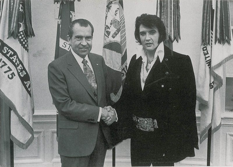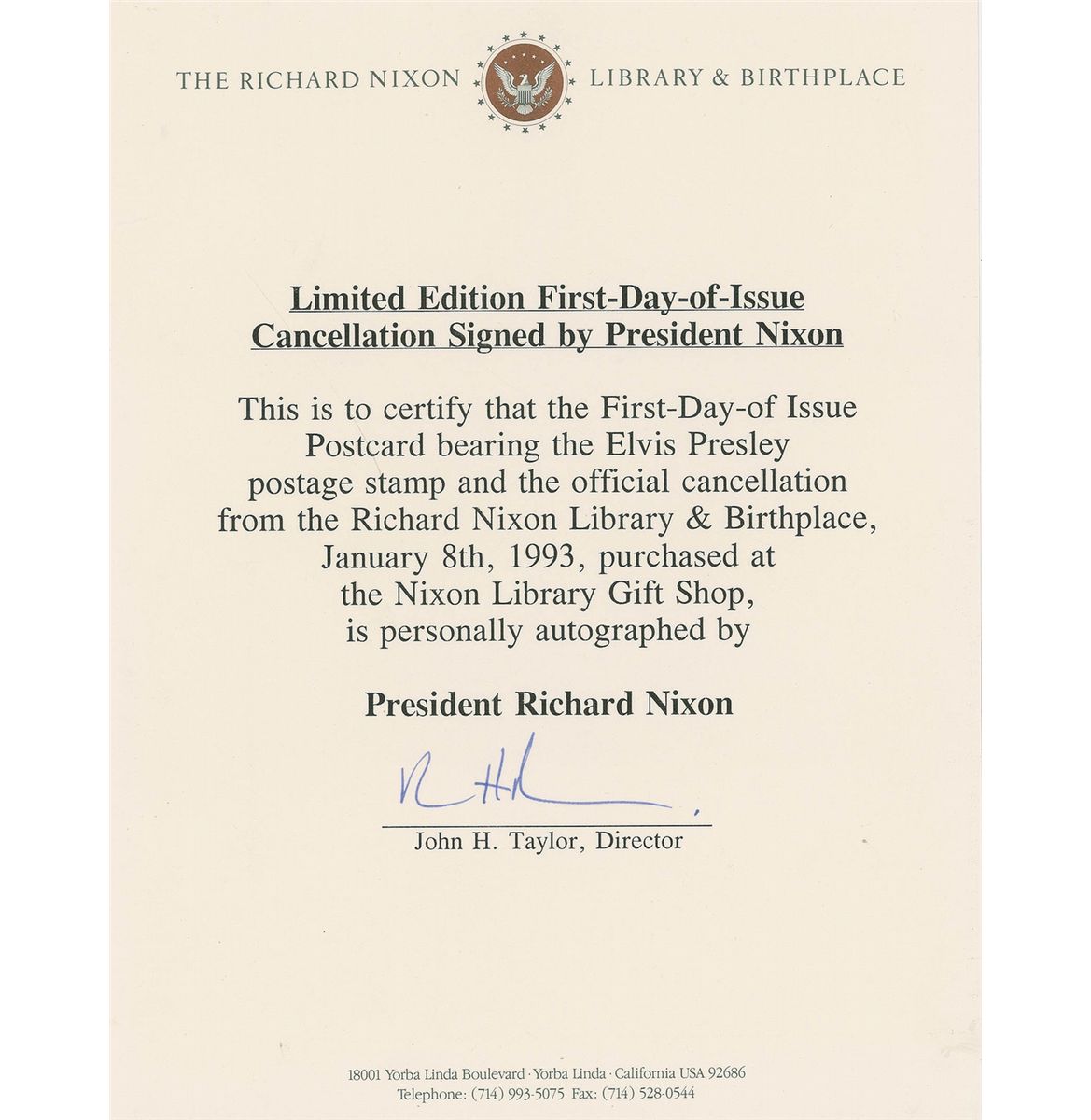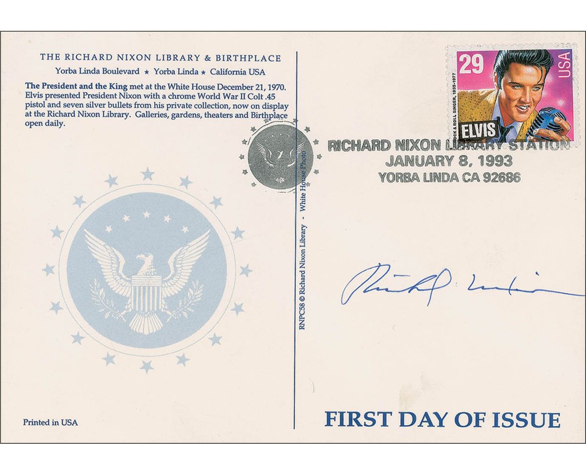 Postcard featuring an image of President Nixon with Elvis at the White House, 7 x 5, with an Elvis stamp affixed to the reverse and first day cancellation from the Nixon presidential library, signed in the address area in blue ink, “Richard Nixon.” In fine condition, with a couple light areas of adhesive remnants. Accompanied by a letter of provenance from the Richard Nixon Library and Birthplace.