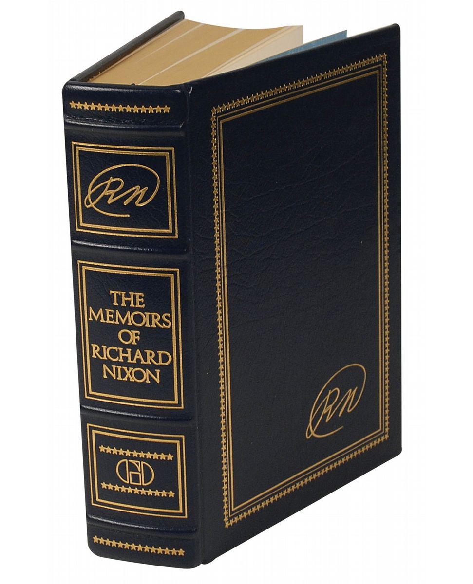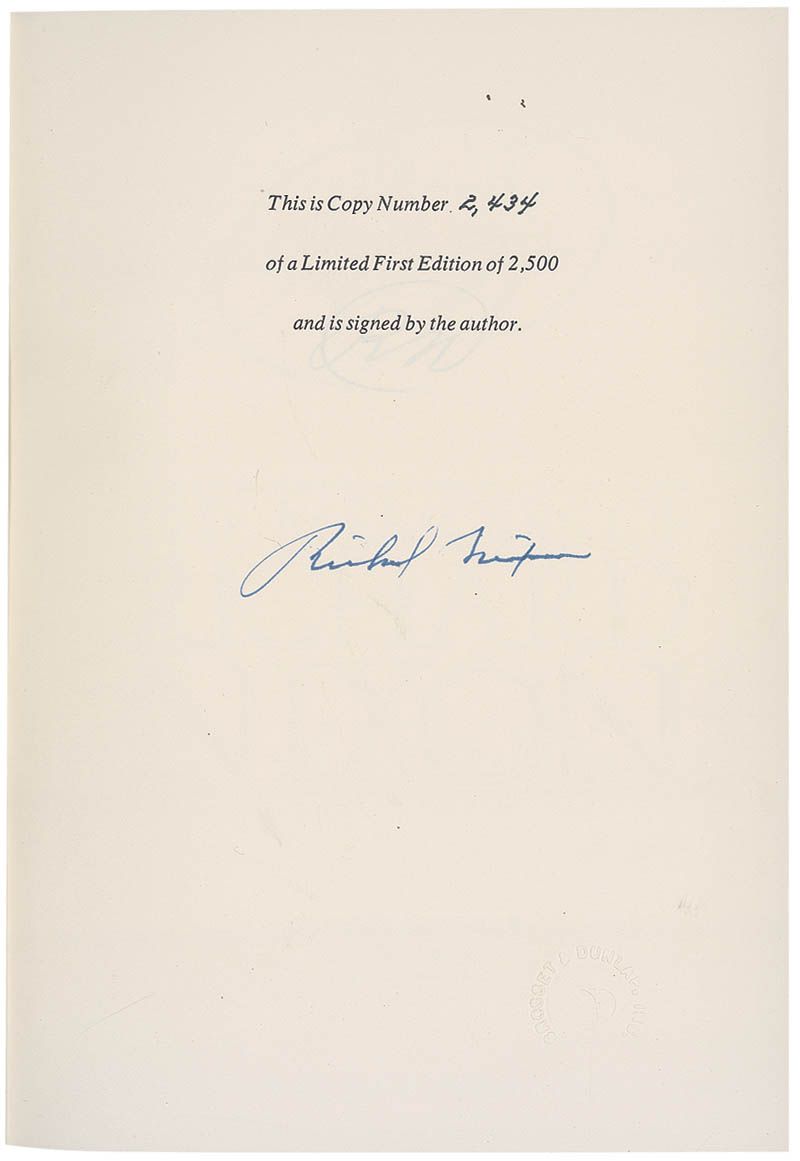 Signed book: The Memoirs of Richard Nixon. First Edition, limited to 2500 copies (This being No. 2434). NY: Grosset and Dunlap, 1987. Hardcover, 7 x 9.5, 1120 pages. Signed on the colophon in blue ink. In very fine condition. Accompanied by the original Grosset and Dunlap certificate of authenticity as well as the original shipping box. Book condition: F/None. Navy leather-bound boards with stamped gilt lettering and decoration, gilted textblock edges, and sky blue silk moiré endpapers. A beautiful copy, in original packaging with no visible flaws.