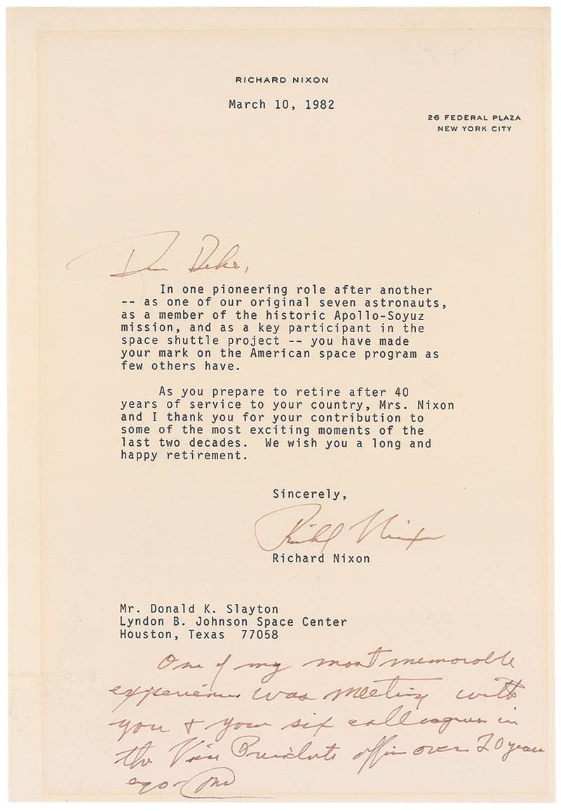 TLS, one page, 7.25 x 10.25, personal letterhead, March 10, 1982. Letter to Deke Slayton, sent on the occasion of his retirement. Nixon writes the greeting at the top, “Dear Deke.” In part: “In one pioneering role after another—as one of our original seven astronauts, as a member of the historic Apollo-Soyuz mission, and as a key participant in the space shuttle project—you have made your mark on the American space program as few others have.” At the bottom, Nixon has added a handwritten postscript, “One of my most memorable experiences was meeting with you & your six colleagues in the Vice President’s office over 20 years ago. RN.” In fine condition, with light block of toning over text and postscript from previous display, and Nixon’s signature and writing a bit faded, but still completely legible. Nixon’s involvement with the space program spanned from the Mercury project to making the historic phone call from the White House to the Apollo 11 astronauts on the surface of the moon.