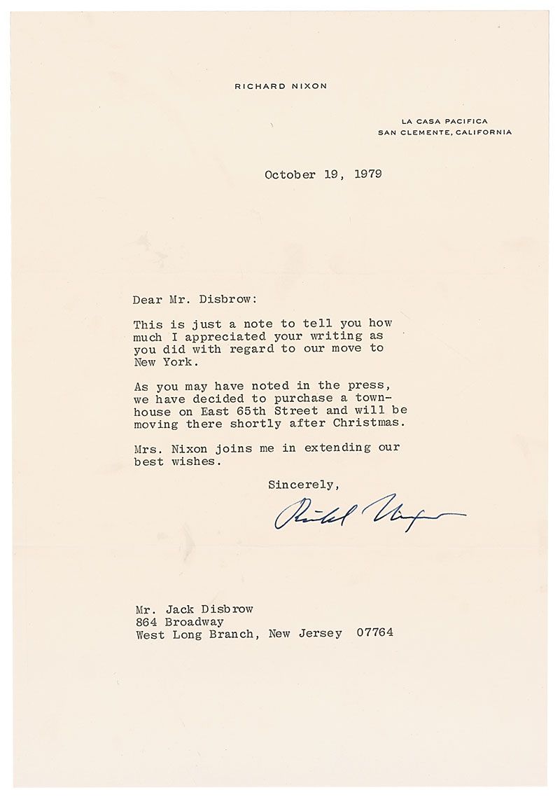 TLS, one page, 7.25 x 10.5, personal letterhead, October 19, 1979. Nixon writes Jack Disbrow of New Jersey. In full: “This is just a note to tell you how much I appreciated your writing as you did with regard to our move to New York. As you may have noted in the press, we have decided to purchase a townhouse on East 65th Street and will be moving there shortly after Christmas. Mrs. Nixon joins me in extending our best wishes.” In fine condition. Accompanied by the original mailing envelope.