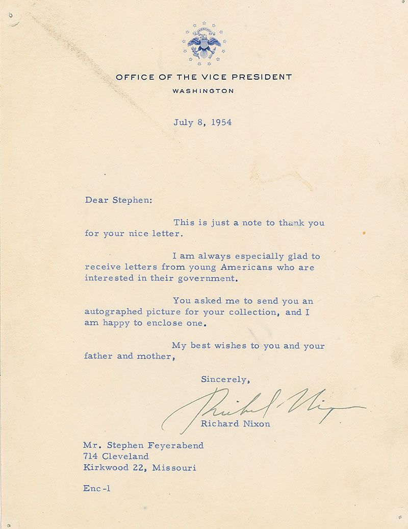 TLS, one page, 7 x 9, Office of the Vice President letterhead, July 8, 1954. Letter of thanks to an admirer. In part: “I am always especially glad to receive letters from young Americans who are interested in their government. You asked me to send you an autographed picture for your collection, and I am happy to enclose one.” In fine condition, with a single tack hole to each corner tip and a bit of scattered light soiling. The aforementioned photo is not included.
