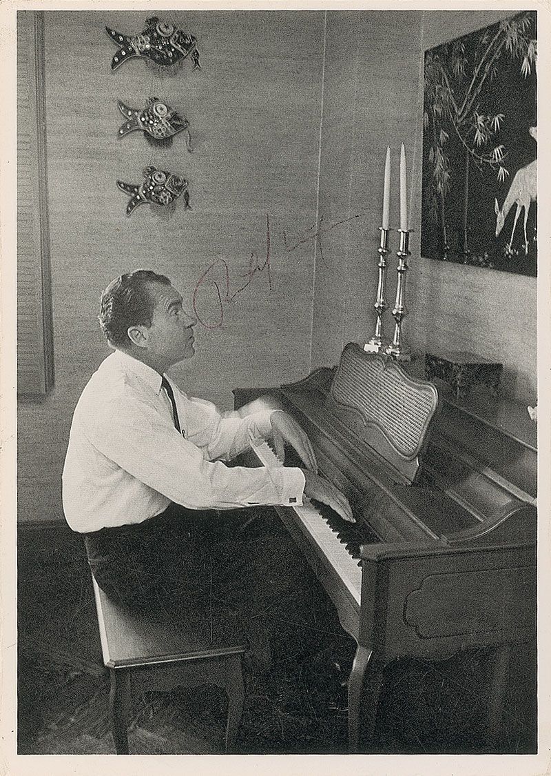 Lighthearted 4.25 x 6 postcard photo of Nixon playing the piano by Phillipe Halsman, signed in black felt tip. In fine condition, with irregular adhesion to signature, which is a shade light.
