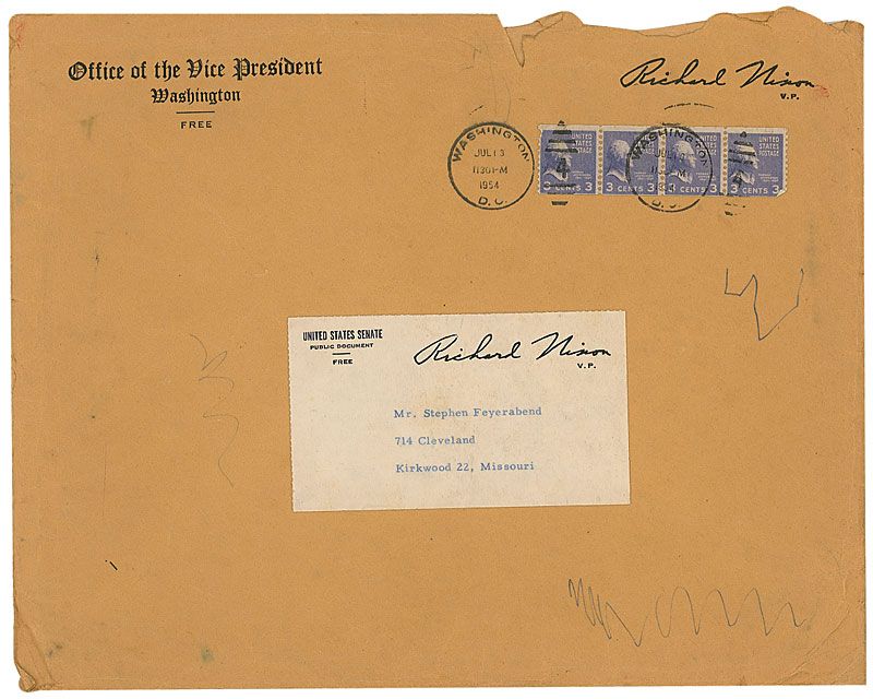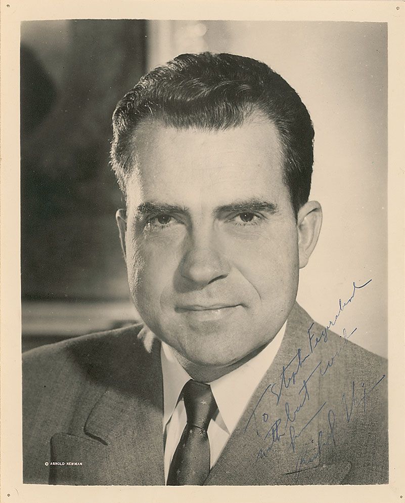 Vintage matte-finish 8 x 10 head-and-shoulders photo, signed and inscribed in blue ink “To Stephen Feyerabend, with best wishes from Richard Nixon.” In fine condition, with a single tack hole to each corner tip and a few trivial creases. Accompanied by the original mailing envelope.