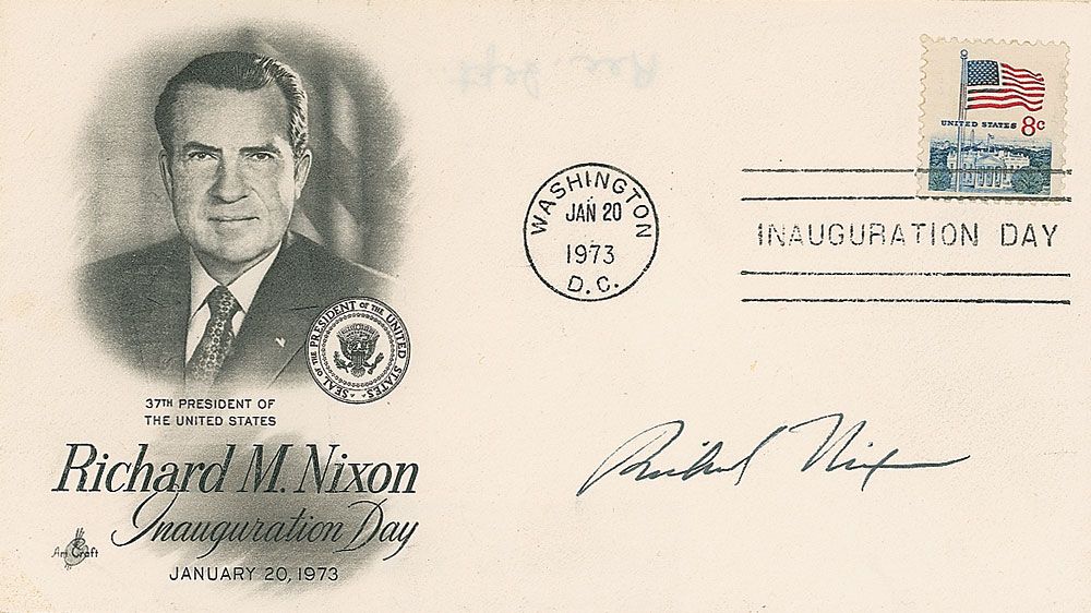 Inauguration Day cover with a cachet honoring Nixon’s 1973 inauguration, signed in black ink. In fine condition.