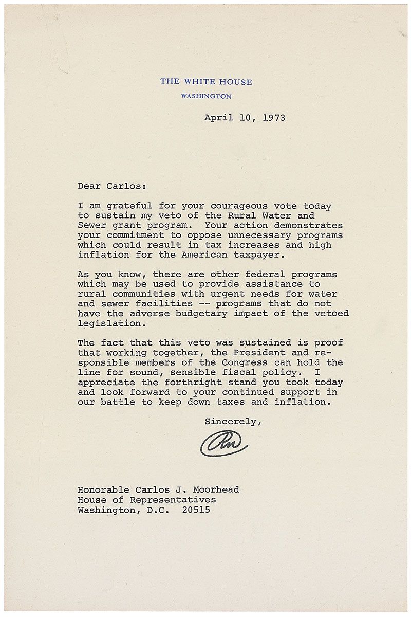 TLS as president signed “RN,” one page, 7 x 10.5, White House letterhead, April 10, 1973. Letter to freshman Republican Congressman Carlos J. Moorhead of California. In full: “I am grateful for your courageous vote today to sustain my veto of the Rural Water and Sewer grant program. Your action demonstrates your commitment to oppose unnecessary programs which could result in tax increases and high inflation for the American taxpayer. As you know, there are other federal programs which may be used to provide assistance to rural communities with urgent needs for water and sewer facilities—programs that do not have the adverse budgetary impact of the vetoed legislation. The fact that this veto was sustained is proof that working together, the President and responsible members of the Congress can hold the line for sound, sensible fiscal policy. I appreciate the forthright stand you took today and look forward to your continued support in our battle to keep down taxes and inflation.” In fine condition, with a light paperclip mark to top edge.