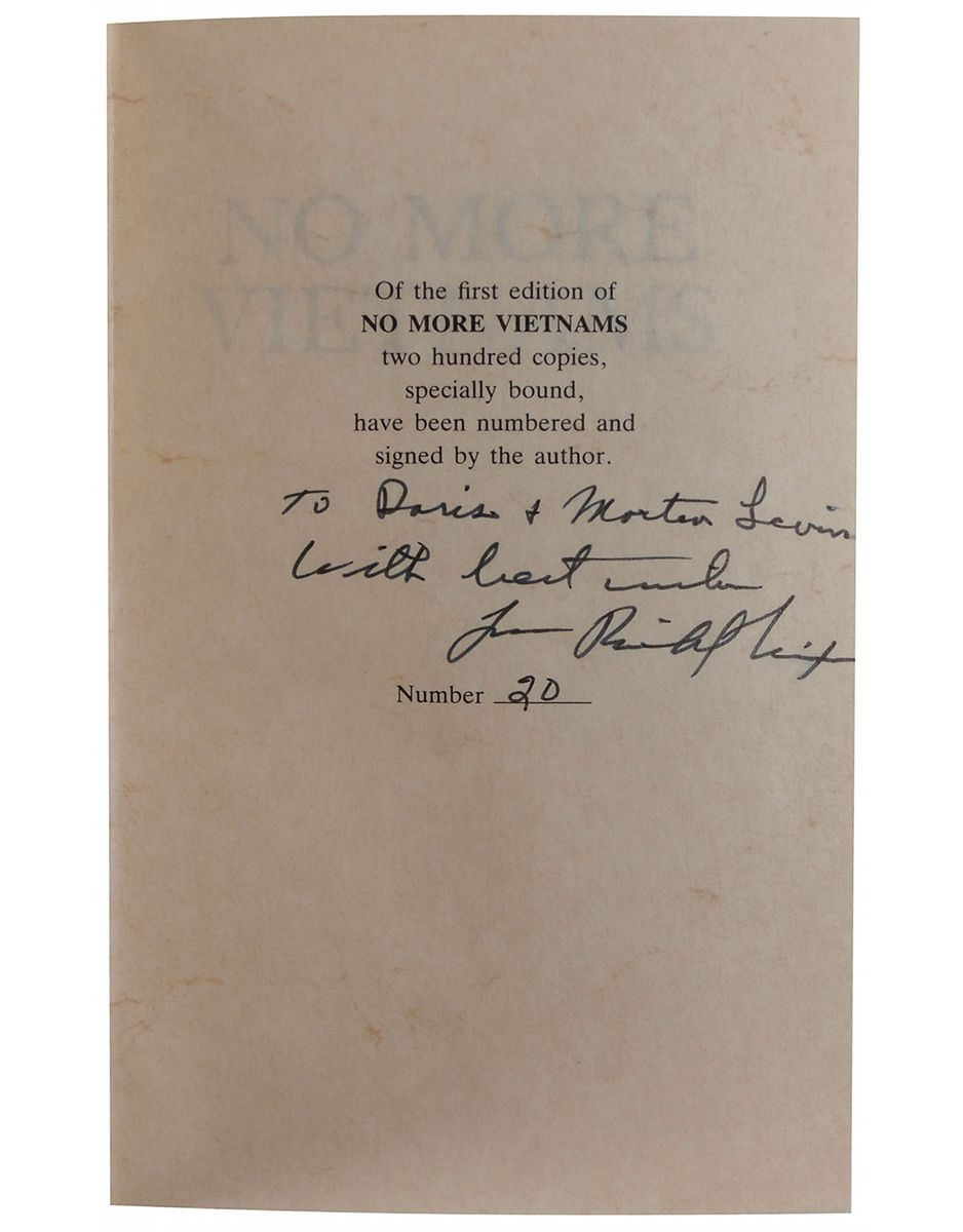 Signed book: No More Vietnams. Presidential edition of 200 copies (this being No. 20). NY: Arbor House, 1985. Hardcover with slipcase, 5.5 x .5, 240 pages. Signed and inscribed on the colophon, “To Doris & Morton Levin, with best wishes from Richard Nixon.” Autographic condition: very fine. Book condition: NF/None. Brown faux-leather-covered boards with gilt titles, gilted textblock edges, and four raised bands on spine; two light scuffs on front, otherwise fine condition. In VG+ tan cloth-covered case.