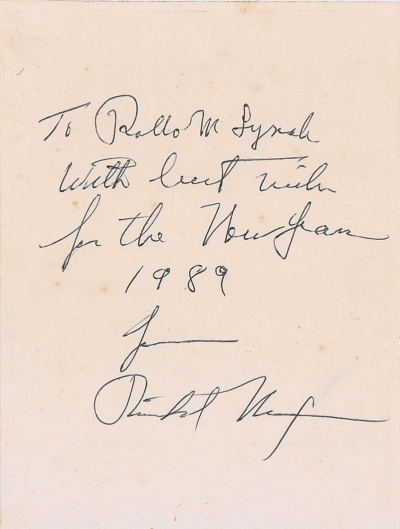 Ink signature and inscription, “To Rollo M. Lynch, with best wishes for the New Year 1989 from Richard Nixon,” on an off-white 6 x 8 sheet. In fine condition, with a horizontal fold passing through date and a few spots of light foxing.