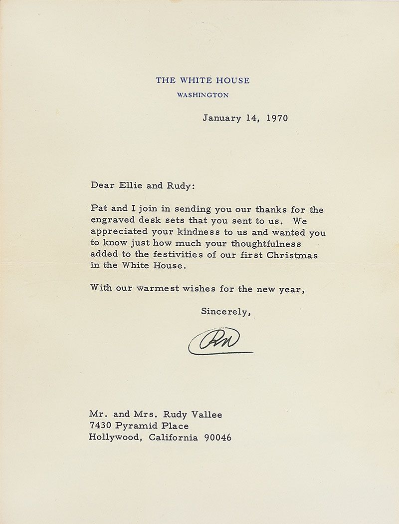 TLS signed “RN,” one page, 6.75 x 8.75, White House letterhead, January 14, 1970. Letter to famous singer/actor Rudy Vallee. In part: “Pat and I join in sending you our thanks for the engraved desk sets that you sent to us. We appreciated your kindness to us and wanted you to know just how much your thoughtfulness added to the festivities of our first Christmas in the White House.” In fine condition. Accompanied by the original mailing envelope.