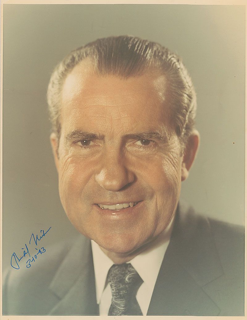 Color satin-finish 10.75 x 14 close-up portrait of Nixon, signed in blue felt tip, “Richard Nixon, 3-10-93.” Moderate scattered creases, otherwise fine condition.