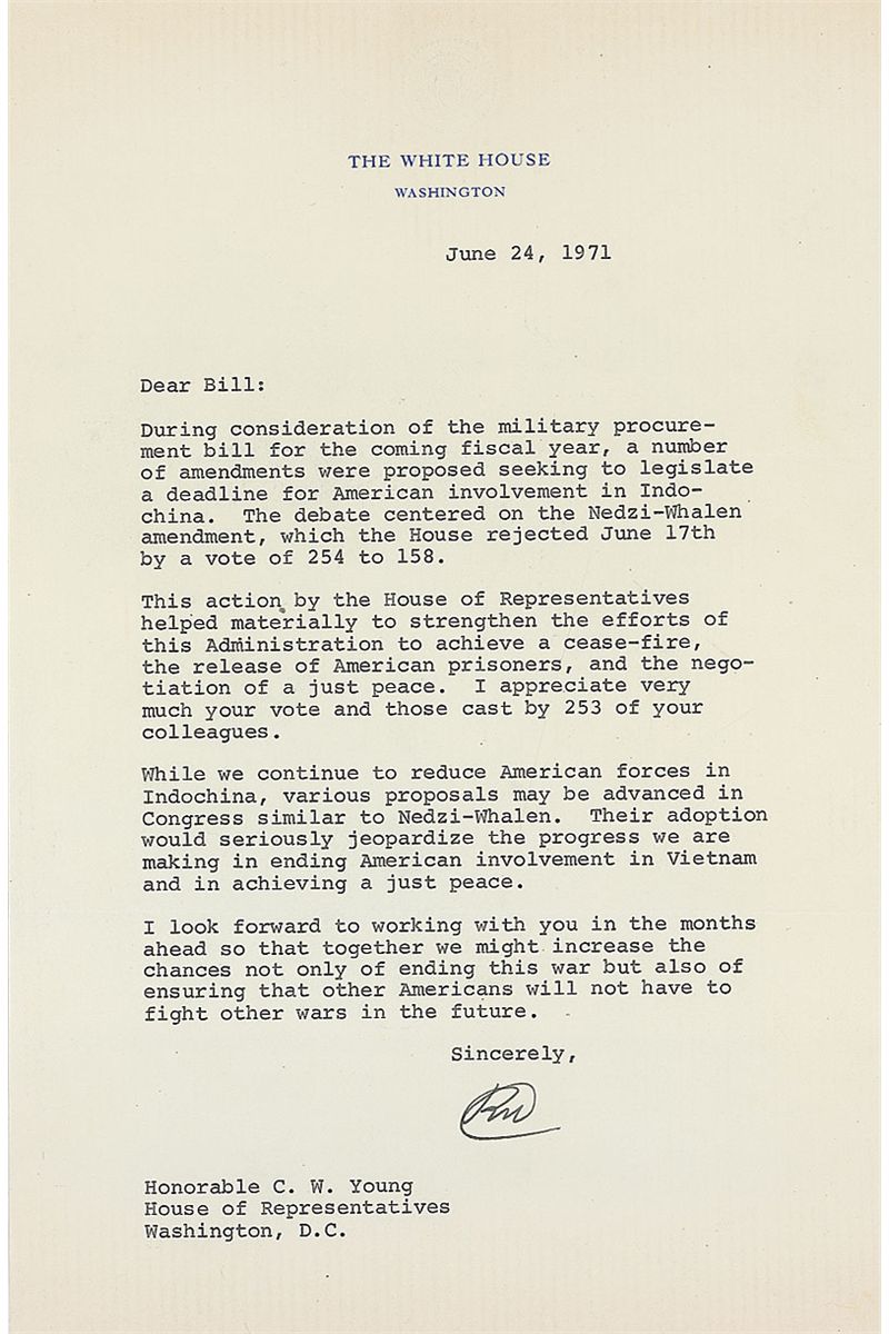 TLS as president, signed “RN,” one page, 6.75 x 10.5, White House letterhead, June 24, 1971. Letter to Congressman C. W. Bill Young, thanking him for his no vote on the Nedzi-Whalen amendment and concerning future amendments to bring an end to American involvement in Indochina. In part: “This action by the House of Representatives helped materially to strengthen the efforts of this Administration to achieve a cease-fire, the release of American prisoners, and the negotiation of a just peace…While we continue to reduce American forces in Indochina, various proposals may be advanced in Congress similar to the Nedzi-Whalen. Their adoption would seriously jeopardize the progress we are making in ending the involvement in Vietnam and in achieving a just peace.” In fine condition. Had the bill passed, funds would have been cut off from supporting US forces in Indochina as of December 31, 1971; while Nixon did seek to end the war, he thought such funding was necessary until the withdrawal of US troops was complete. A choice letter with terrific content regarding the Nixon administration’s policy toward Vietnam.