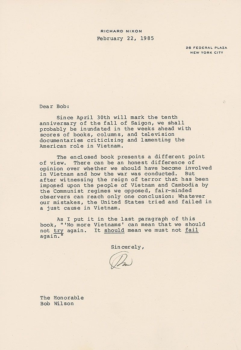 Choice TLS signed “RN,” one page, 7.25 x 10.5, personal letterhead, February 22, 1985. Letter to former Congressman Bob Wilson. In part: “Since April 30th will mark the tenth anniversary of the fall of Saigon, we shall probably be inundated in the weeks ahead with scores of books, columns, and television documentaries criticizing and lamenting the American role in Vietnam…There can be an honest difference of opinion over whether we should have become involved in Vietnam and how the war was conducted. But after witnessing the reign of terror that has been imposed upon the people of Vietnam and Cambodia by the Communist regimes we opposed, fair-minded observers can reach only one conclusion: whatever our mistakes, the United States tried and failed in a just cause in Vietnam. As I put it in the last paragraph of this book, ‘‘No more Vietnams’ can mean what we should not try again. It should mean we must not fail again.’” In fine condition. An amazing letter offering the ex-president’s views on the most controversial American actions of his era.
