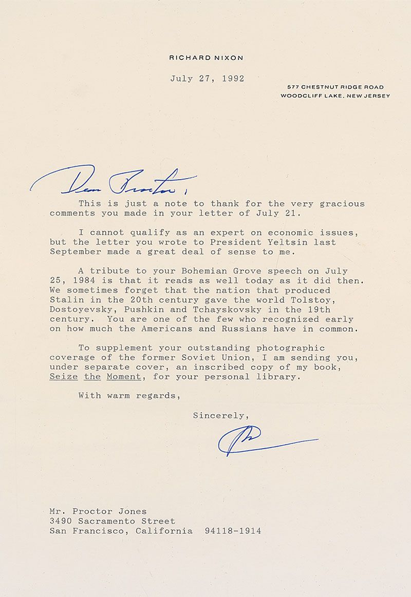 TLS signed “RN,” one page, 7.25 x 10.5, personal letterhead, July 27, 1992. Letter to his friend Proctor Jones, with Nixon handwriting the greeting. In part: “I cannot qualify as an expert on economic issues, but the letter you wrote to President Yeltsin last September made a great deal of sense to me. A tribute to your Bohemian Grove speech on July 25, 1984 is that it reads as well today as it did then. We sometimes forget that the nation that produced Stalin in the 20th century gave the world Tolstoy, Dostoyevsky, Pushkin, and Tchaiykovsky in the 19th century. You are one of the few who recognized early on how much the Americans and Russians have in common.” In fine condition. A letter boasting great content, harkening back to Nixon’s foreign policies while president, including his work to improve Soviet and American relations.