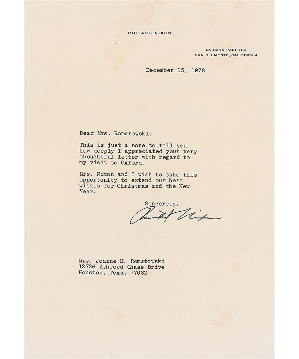 TLS, one page, 7.25 x 10.25, personal letterhead, December 15, 1978. Letter of thanks to Joanne Romatowski. In part: “This is just a note to tell you how deeply I appreciated your very thoughtful letter with regard to my visit to Oxford.” In fine condition, with a bit of scattered light toning to upper portion. Accompanied by the original mailing envelope.