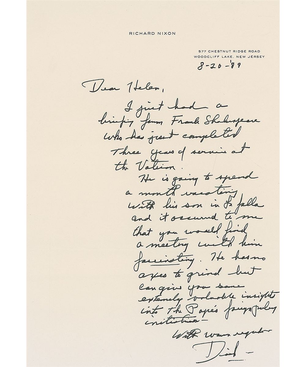 ALS signed “Dick,” one page, 7.25 x 10.5, personal letterhead, August 20, 1989. Letter to Helen Copley of Copley Newspapers. In full: “I just had a briefing from Frank Shakespeare who has just completed three years of service at the Vatican. He is going to spend a month vacating [sic, vacationing] with his son and it occurred to me that you would find a meeting with him fascinating. He has axes to grind but can give you some extremely valuable insights into the Pope’s foreign policy initiatives.” In fine condition. Shakespeare served as director of the US Information Agency during Nixon’s presidency, and Reagan later appointed him as the first US ambassador to the Vatican. Autograph letters from Nixon are very scarce, especially with such intriguing content.