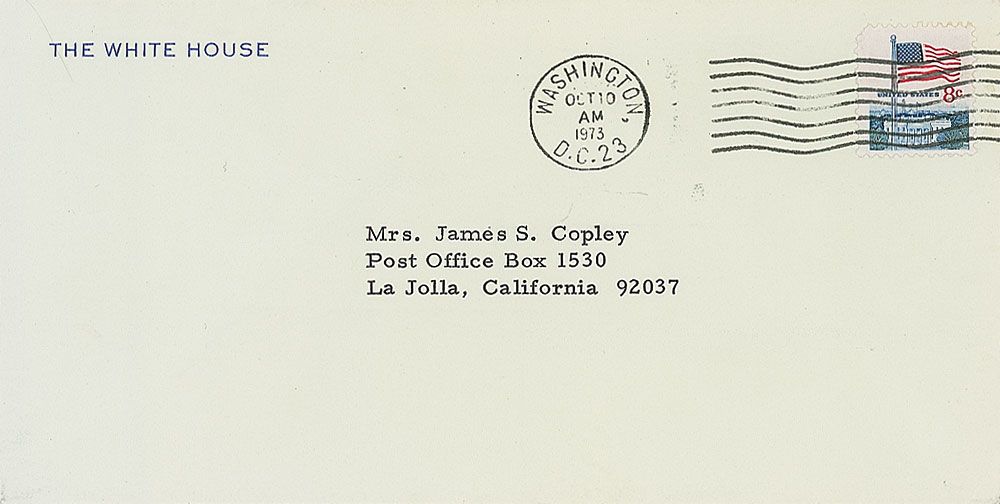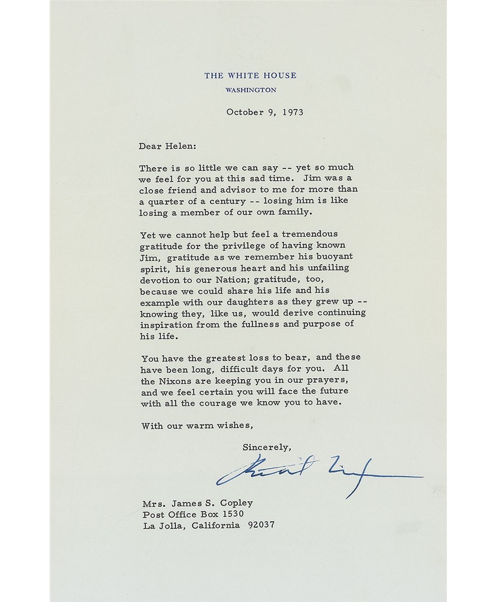 TLS as president, one page, 7 x 10.5, White House letterhead, October 9, 1973. Letter to Helen Copley, the widow of newspaper publisher James S. Copley. In part: “There is so little we can say—yet so much we feel for you at this sad time. Jim was a close friend and advisor to me for more than a quarter of a century—losing him is like losing a member of our own family. Yet we cannot help but feel a tremendous gratitude for the privilege of having known Jim, gratitude as we remember his buoyant spirit, his generous heart and his unfailing devotion to our Nation; gratitude, too, because we could share his life and his example with our daughters as they grew up—knowing they, like us, would derive continuing inspiration from the fullness and purpose of his life. You have the greatest loss to bear, and these have been long, difficult days for you. All the Nixons are keeping you in our prayers, and we feel certain you will face the future with all the courage we know you to have.” In fine condition. Accompanied by the original mailing envelope. James Copley, whose newspapers had always supported Nixon, had passed away of cancer just three days earlier. The date this letter was written is of particular note—on the evening of October 9, Vice President Spiro T. Agnew informed President Nixon of his intent to resign, effective the following day. This also bears Nixon’s infrequently seen full presidential signature, which was usually reserved for official documents. A great combination of associations topped off by his extremely rare full signature on a letter as president.