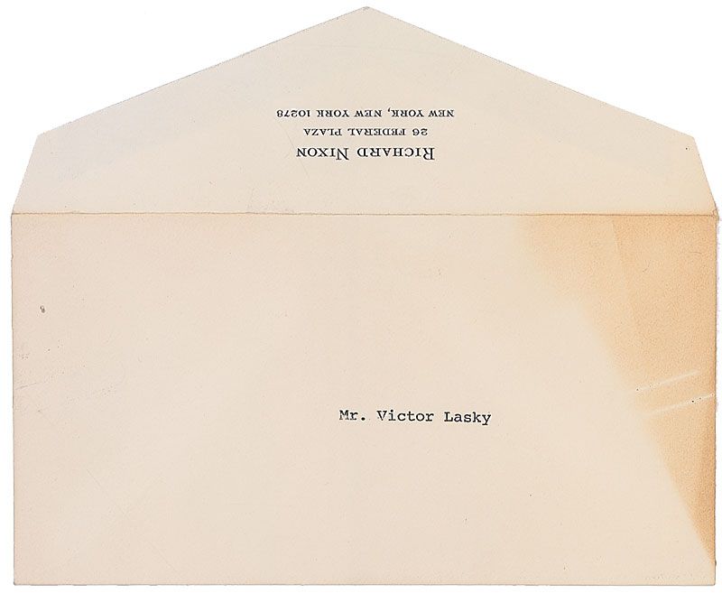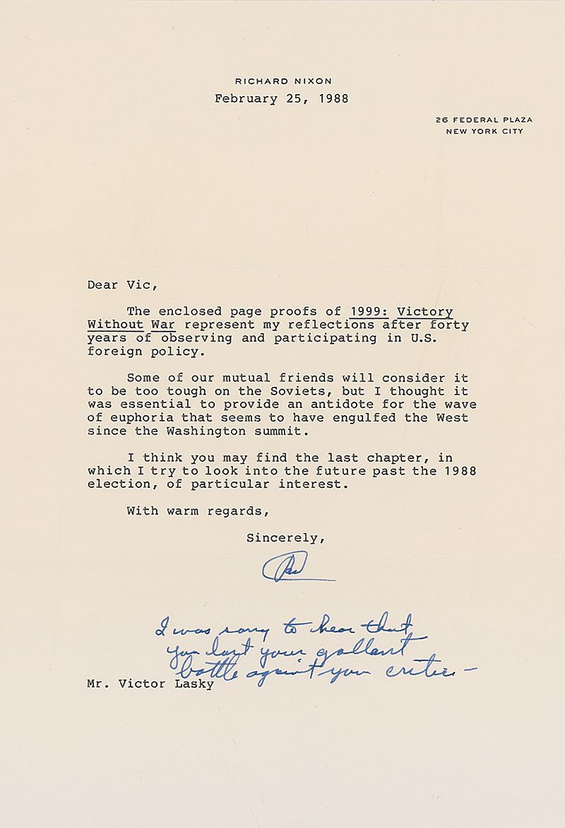 TLS signed “RN,” one page, 7.25 x 10.25, personal letterhead, February 25, 1988. Letter to conservative columnist Victor Lasky which accompanied page proofs of Nixon’s book, 1999: Victory Without War. In part: “Some of our mutual friends will consider it to be too tough on the Soviets, but I thought it was essential to provide an antidote for the wave of euphoria that seems to have engulfed the West since the Washington summit.” After his signature, Nixon adds a brief handwritten postscript which reads: “I was sorry to hear that you lost your gallant battle against your critics.” In fine condition. Accompanied by the original mailing envelope.