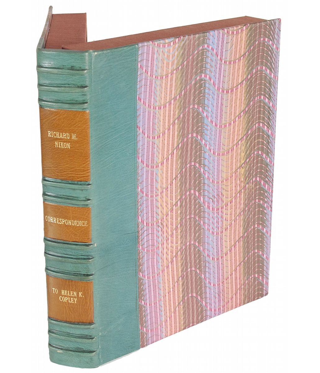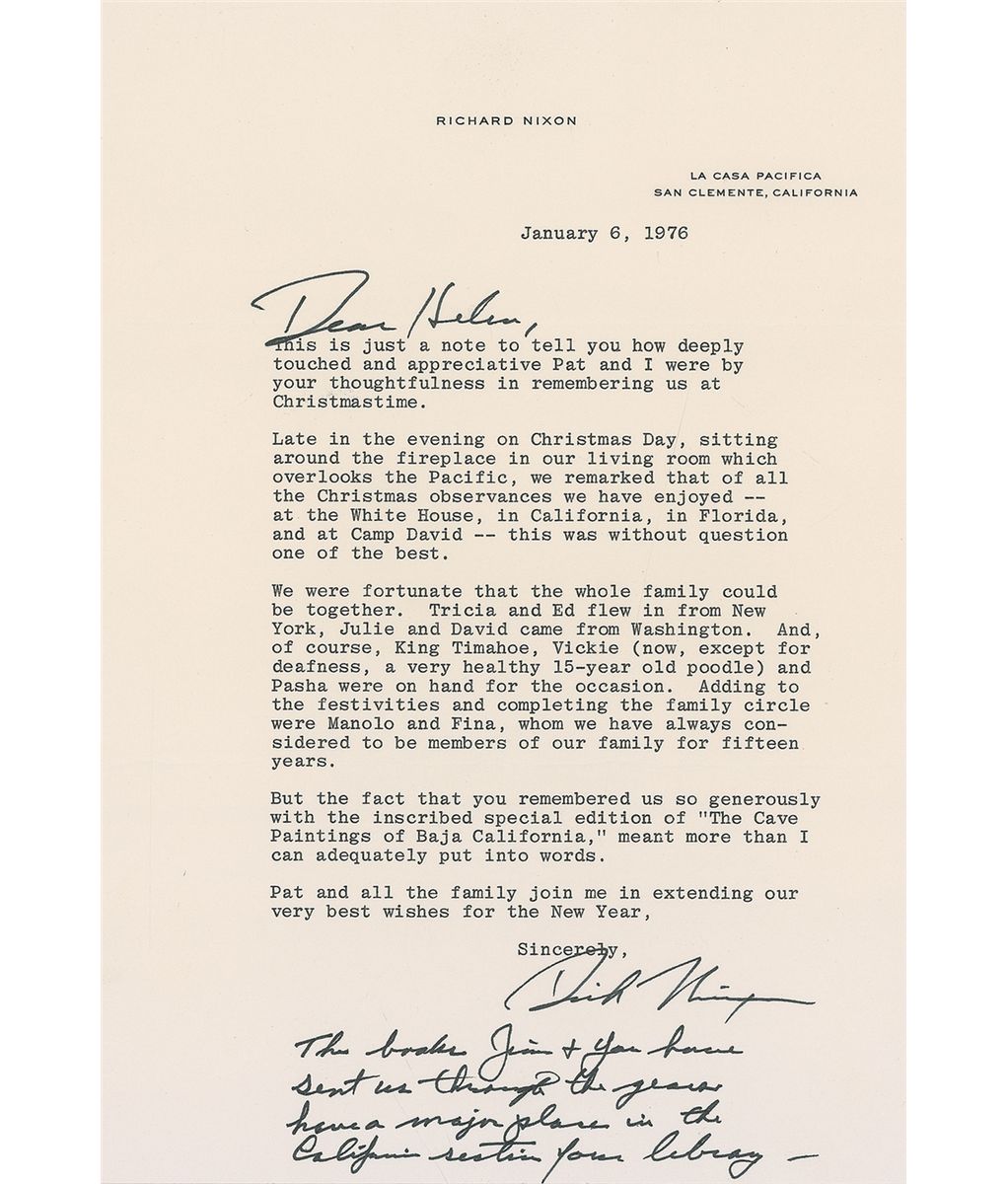 Second letter, dated January 6, 1976, reads, in part: “This is just a note to tell you how deeply touched and appreciative Pat and I were by your thoughtfulness in remembering us at Christmastime. Late in the evening on Christmas Day, sitting around the fireplace in our living room which overlooks the Pacific, we remarked that of all the Christmas observances we have enjoyed—at the White House, in California, in Florida, and at Camp David—this was without question one of the best. We were fortunate that the whole family could be together. Tricia and Ed flew in from New York, Julie and David came from Washington.” Postscript at the bottom reads, “The books Jim & you have sent us through the years have a major place in the California section of our library.” The letters are housed in a luxurious custom-made clamshell case. In fine condition.