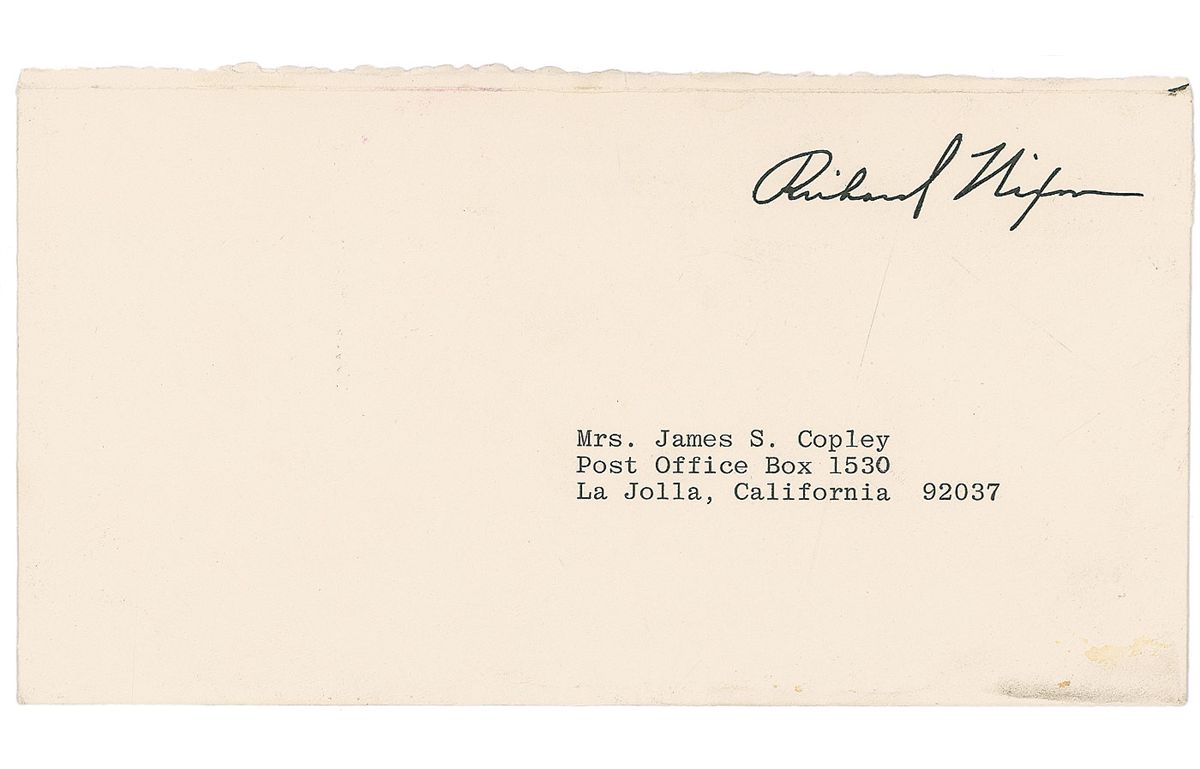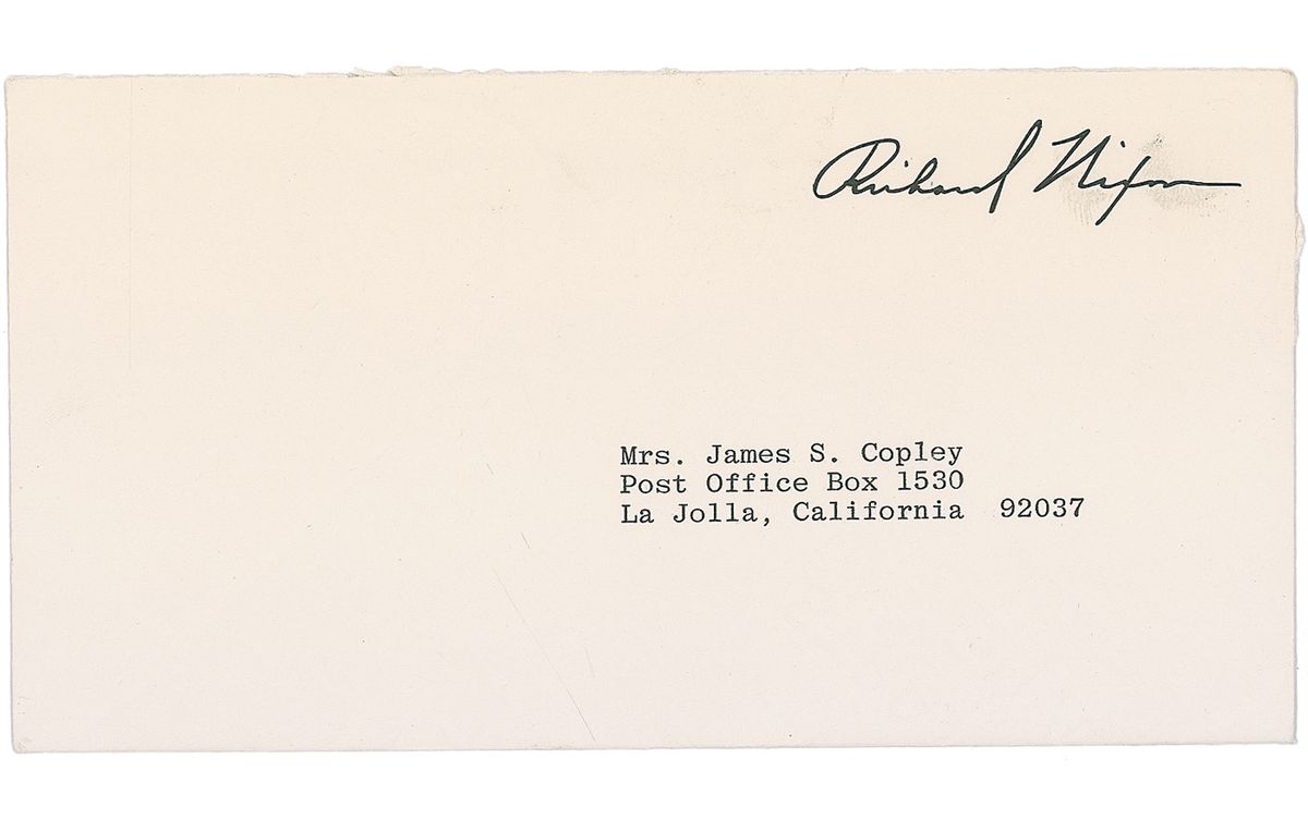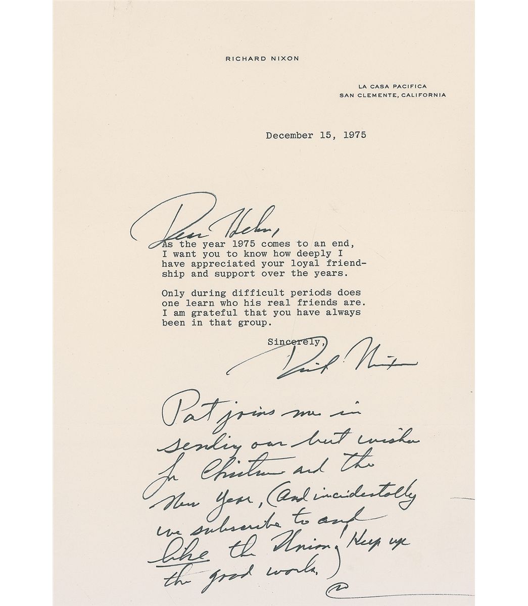 Two TLSs, both signed, “Dick Nixon,” each one page, 7.25 x 10.5, personal letterhead. Both letters are to Helen Copley, the widow of newspaper publisher James S. Copley, with Nixon adding the greeting in his own hand, as well as a postscript to each letter. The first letter, dated December 15, 1975, reads, in full: “As the year 1975 comes to an end, I want you to know how deeply I have appreciated your loyal friendship and support over the years. Only during difficult periods does one learn who his real friends are. I am grateful that you have always been in that group.” Nixon’s handwritten postscript reads: “Pat joins me in sending our best wishes for Christmas and the New Year, (And incidentally we subscribe to and like the Union. Keep up the good work.) N.”