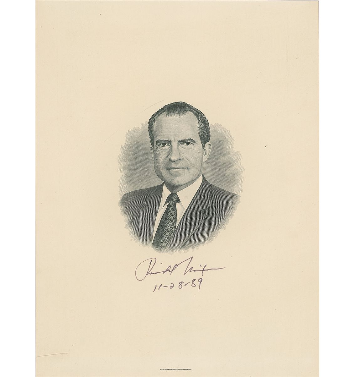 Uncommon 9 x 12 engraved portrait of Nixon produced by the Bureau of Engraving and Printing, signed below the vignette in black felt tip, “Richard Nixon, 11-28-1989.” An inch-long cut to the lower left corner, otherwise fine condition.