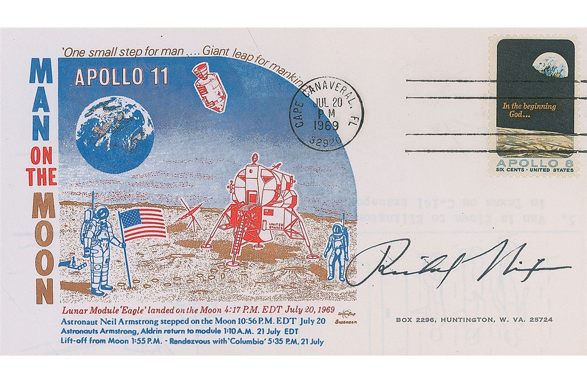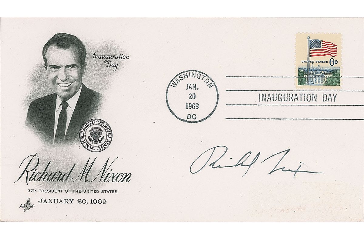 Two commemorative covers: one inauguration day cover with a cachet honoring Nixon, signed in black felt tip; and one with a cachet honoring the Apollo 11 mission, also signed in black felt tip. In overall fine condition.